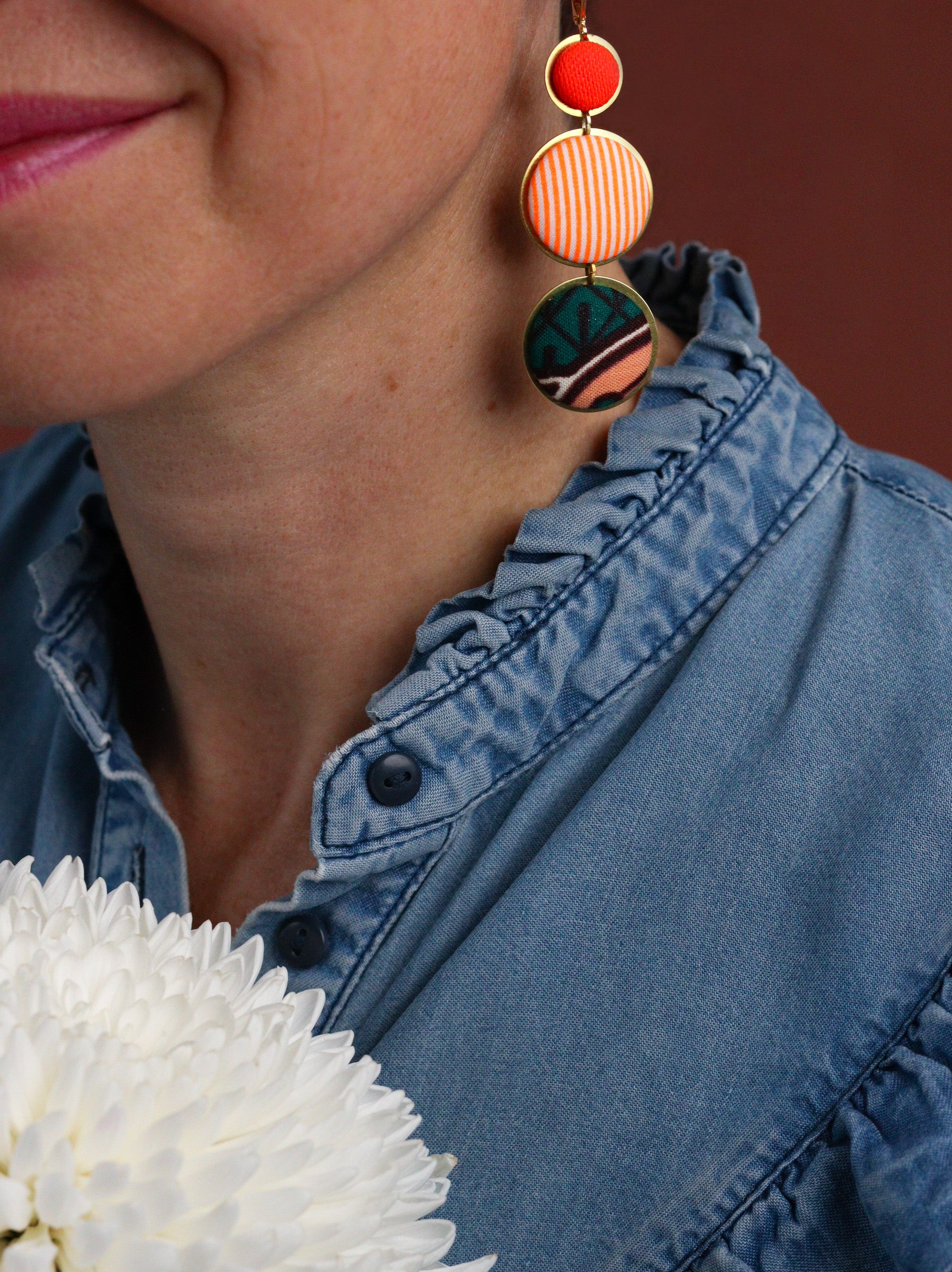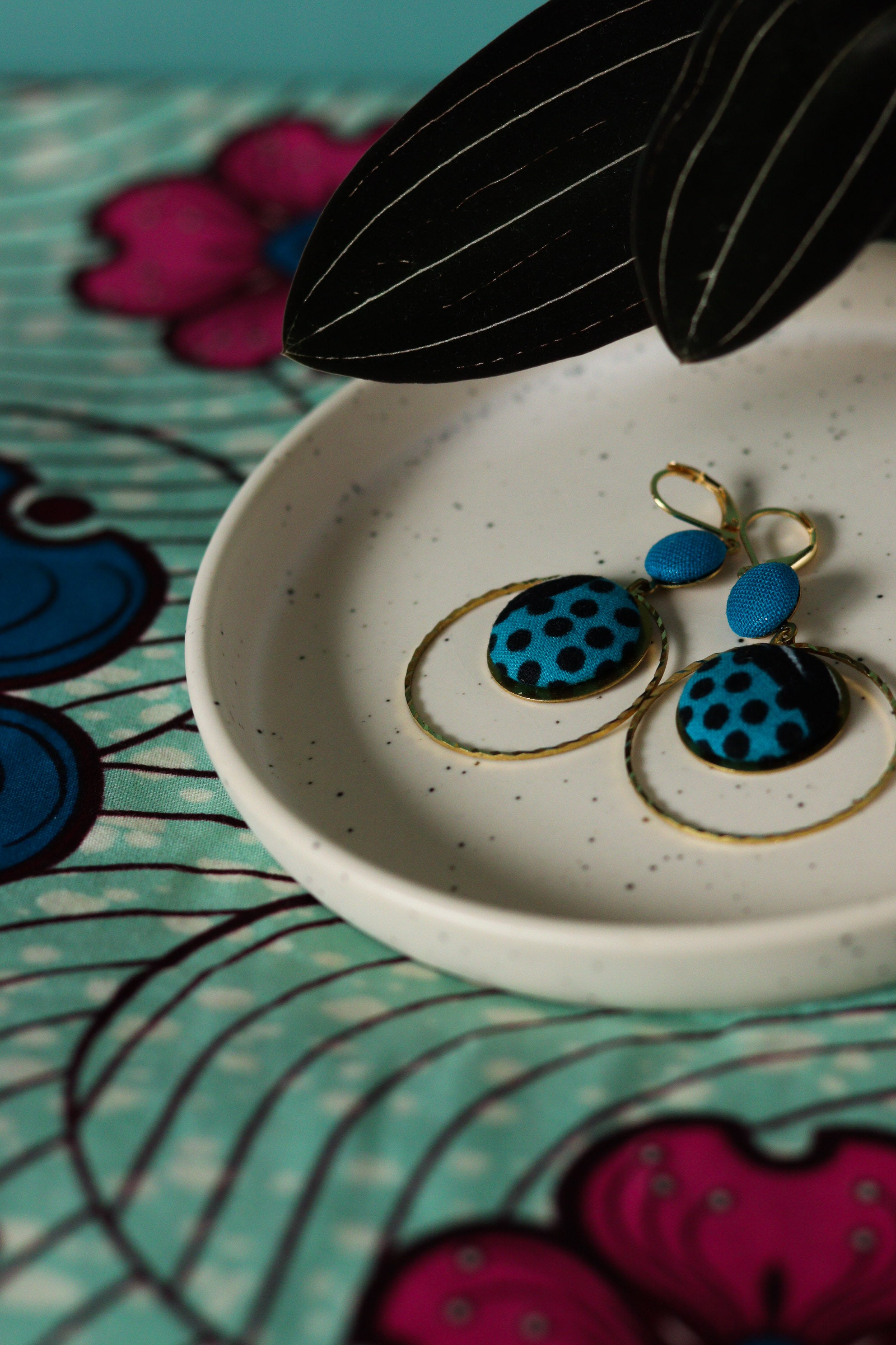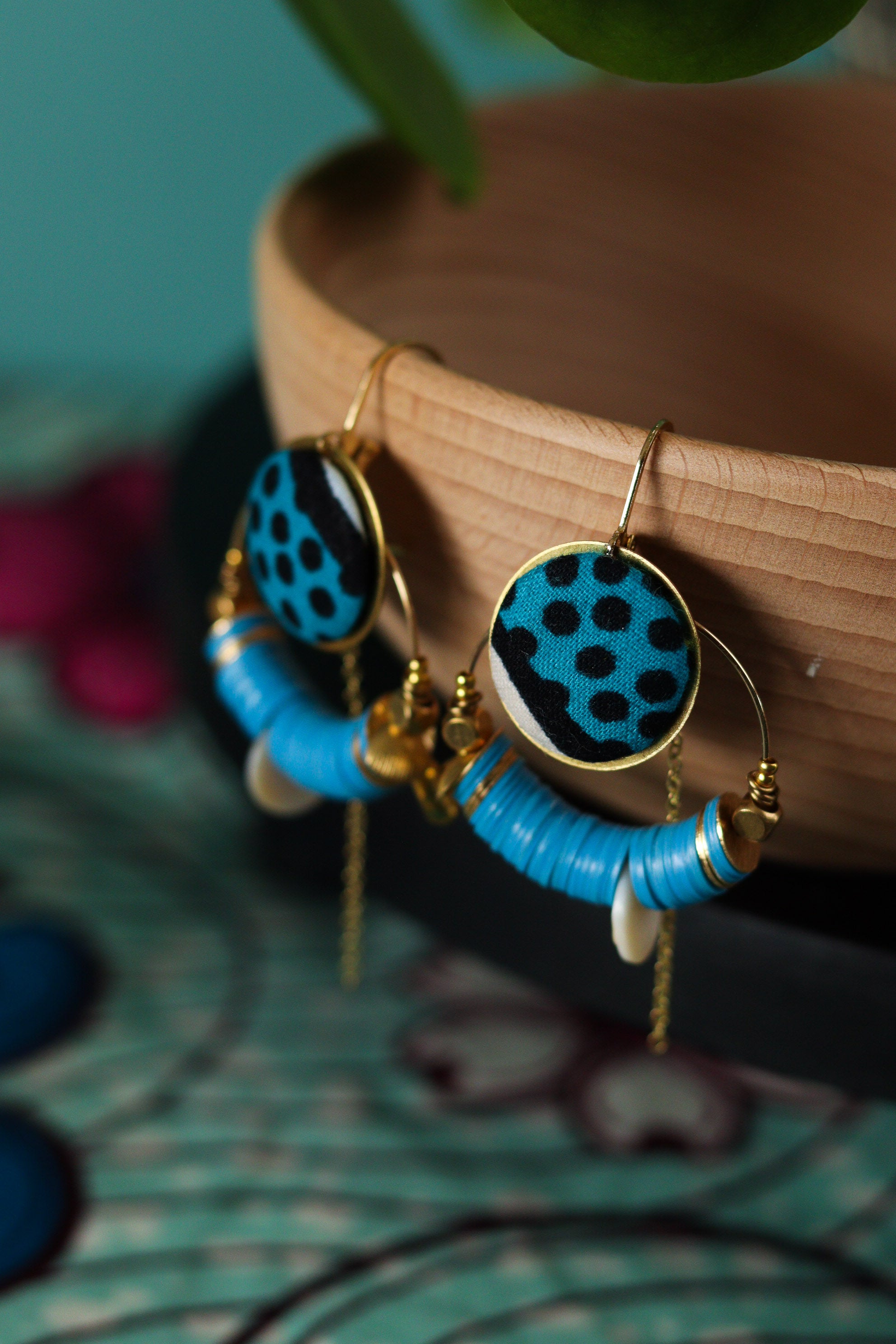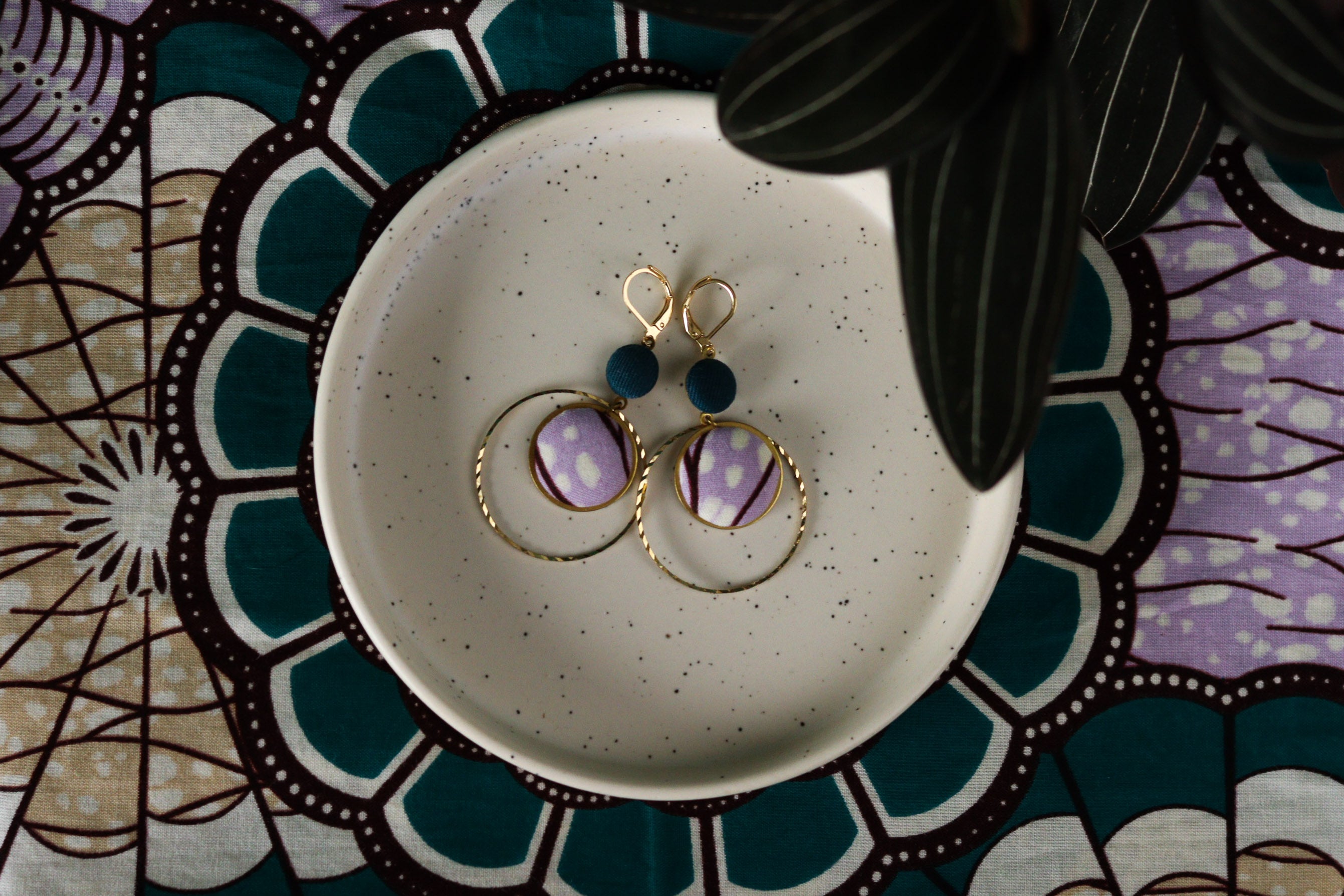 Cette septième collection de boucles d'oreilles africaines en wax a été conçue en collaboration avec Olivia, créatrice de bijoux textiles depuis 2004, sous le nom de Yum Yum Violette. De son travail poétique et de mes chutes de tissus colorées sont nées de jolies pièces uniques à l'âme voyageuse : des créoles mariées à des cuirs colorés, des pièces originales mixant les tissus, des boucles afro-chic à offrir ou à collectionner !