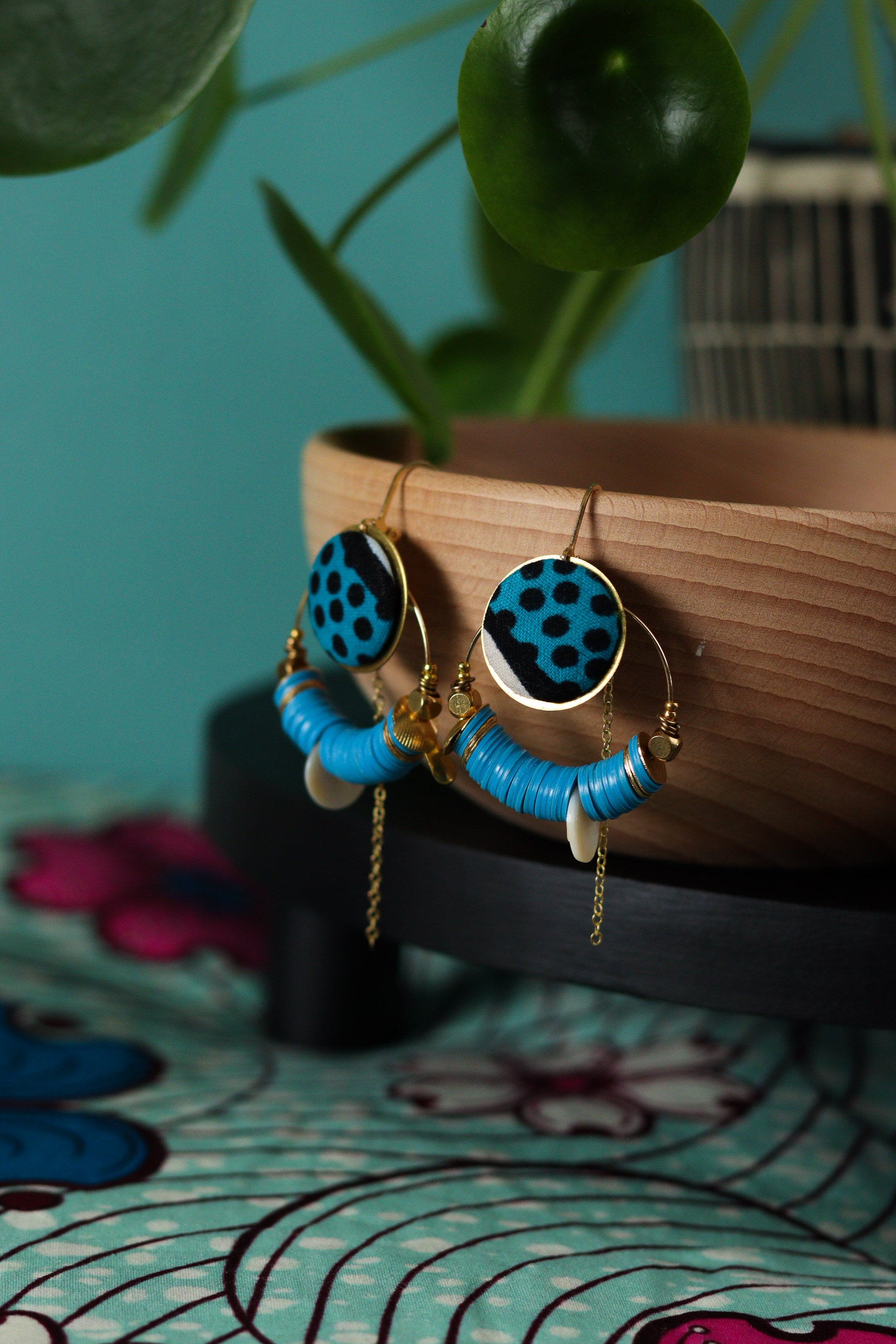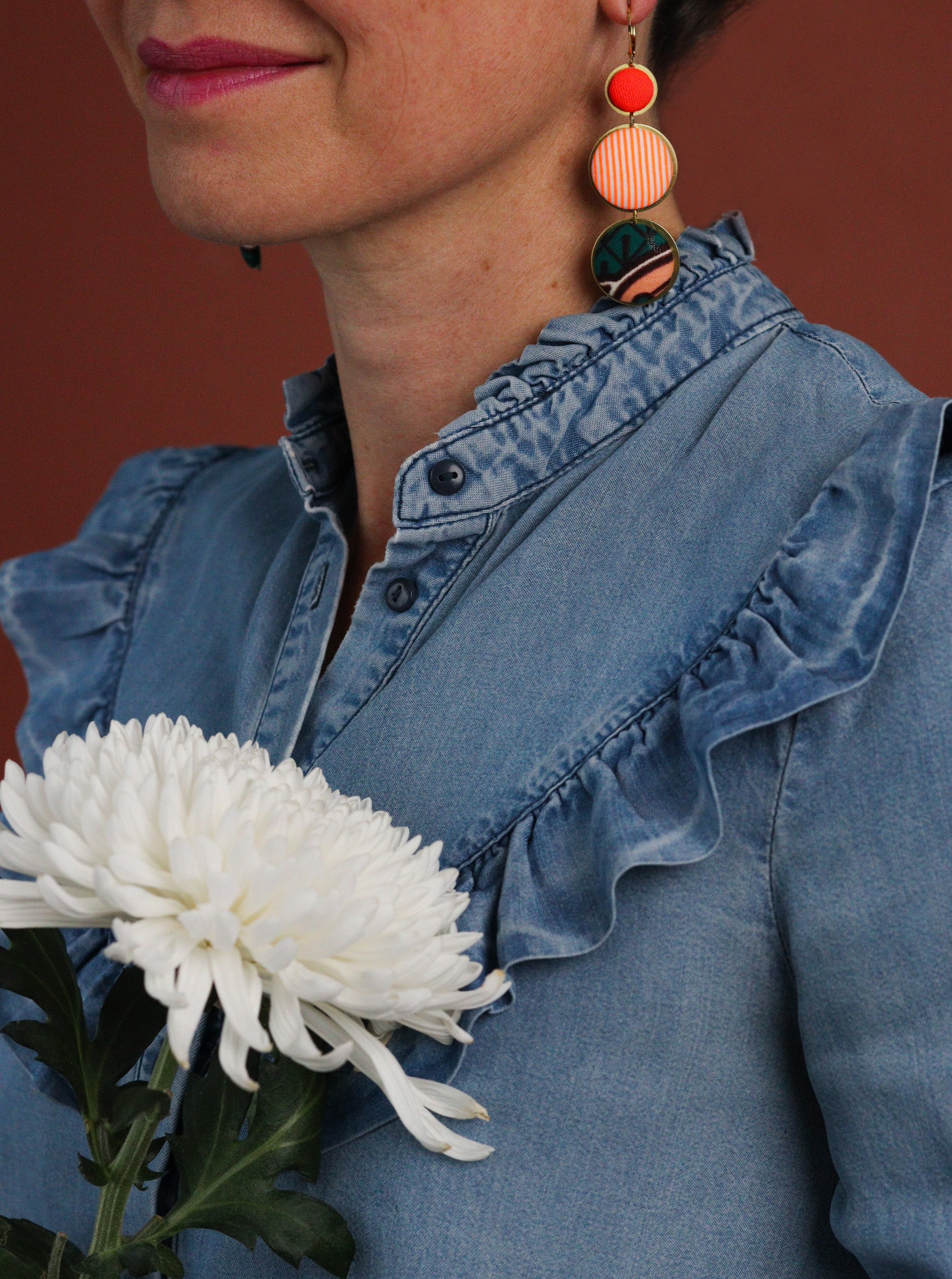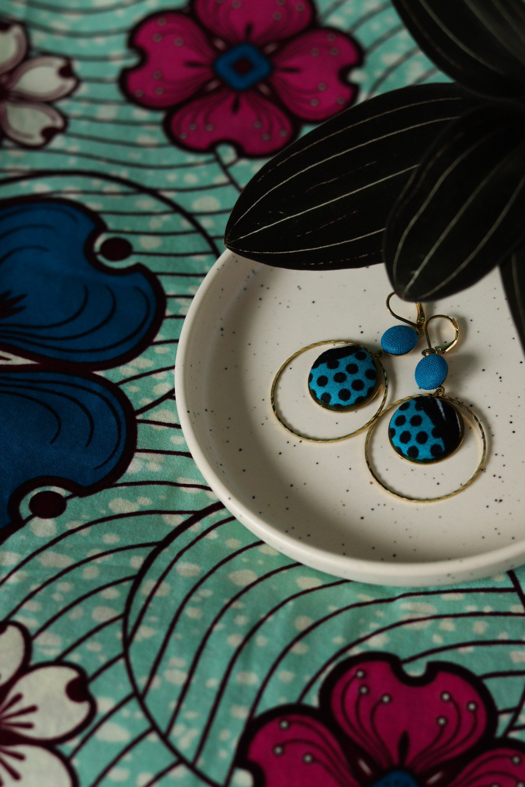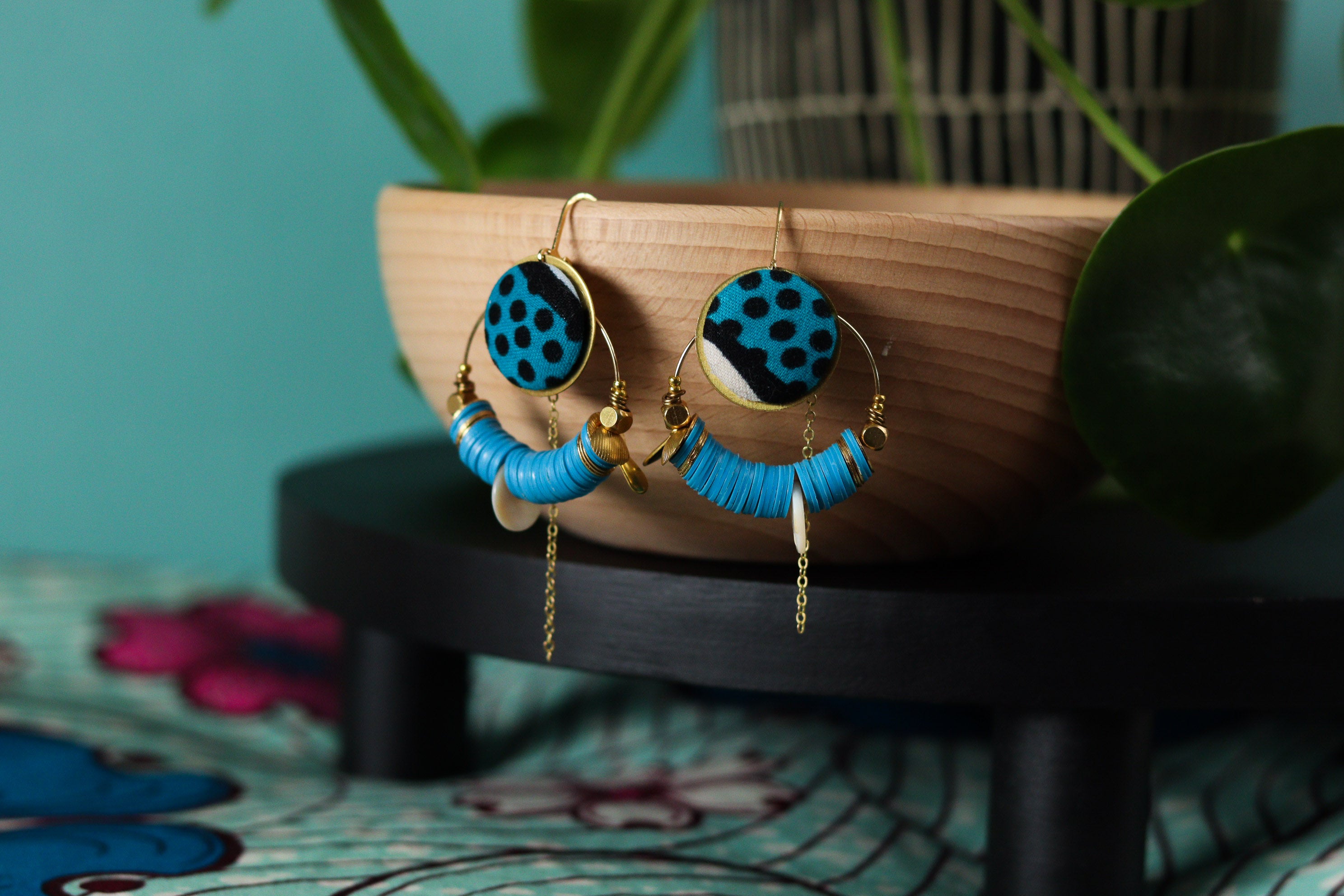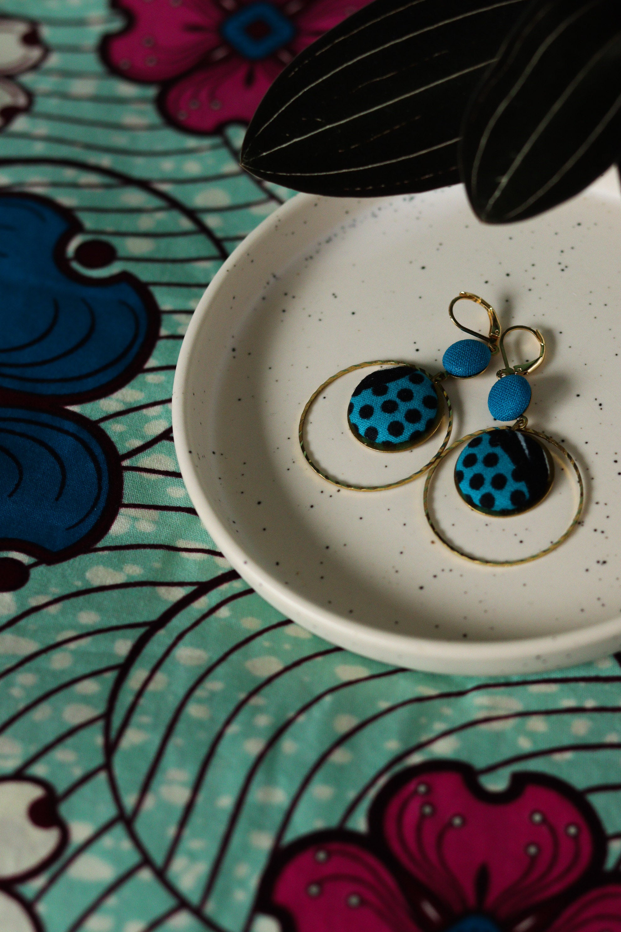 Cette septième collection de boucles d'oreilles africaines en wax a été conçue en collaboration avec Olivia, créatrice de bijoux textiles depuis 2004, sous le nom de Yum Yum Violette. De son travail poétique et de mes chutes de tissus colorées sont nées de jolies pièces uniques à l'âme voyageuse : des créoles mariées à des cuirs colorés, des pièces originales mixant les tissus, des boucles afro-chic à offrir ou à collectionner !