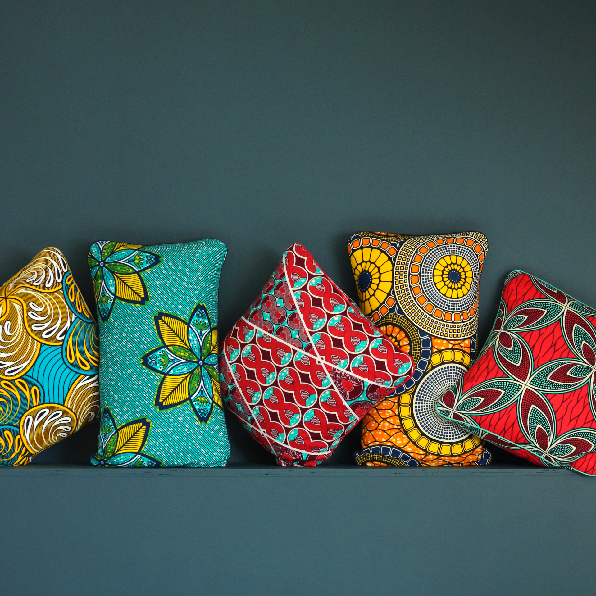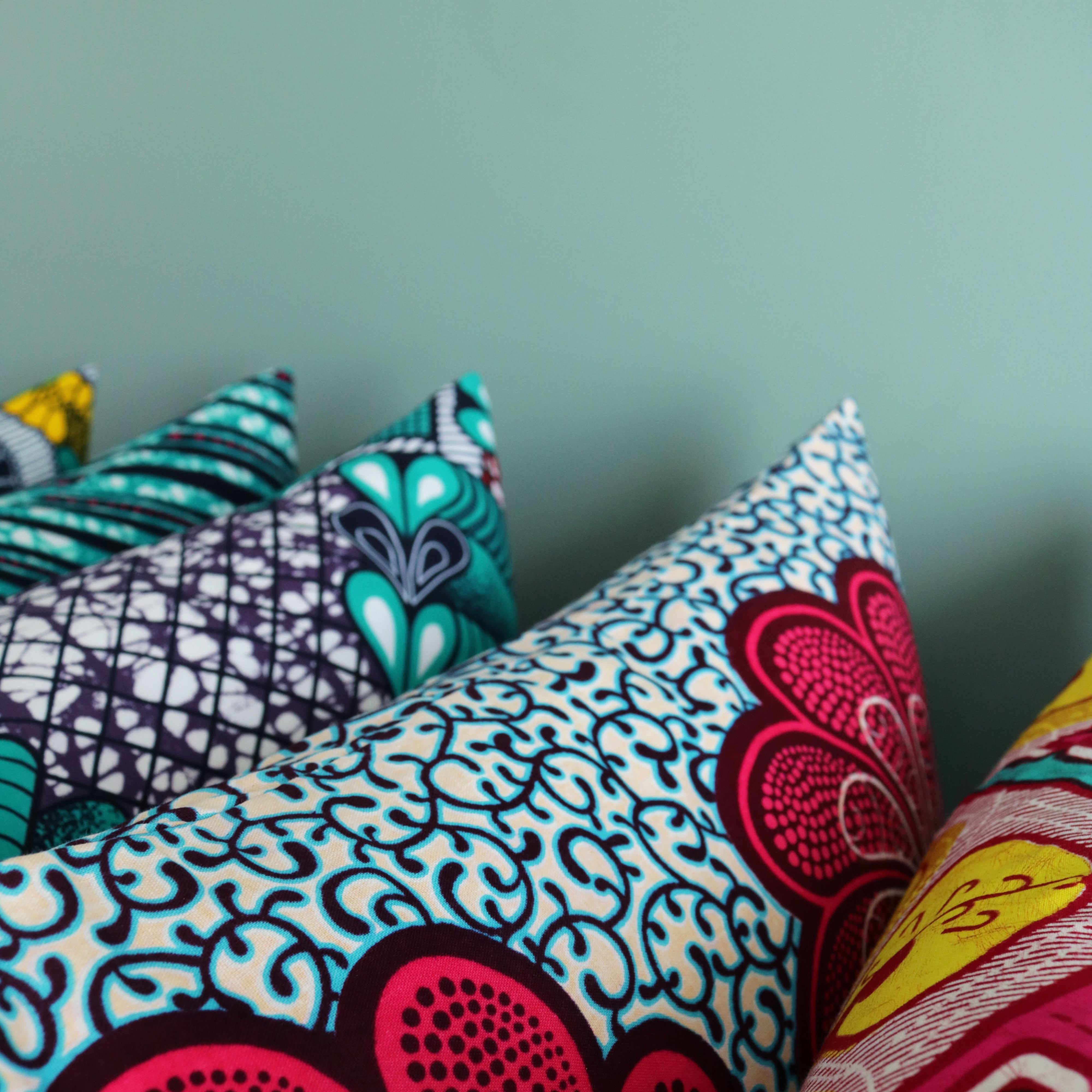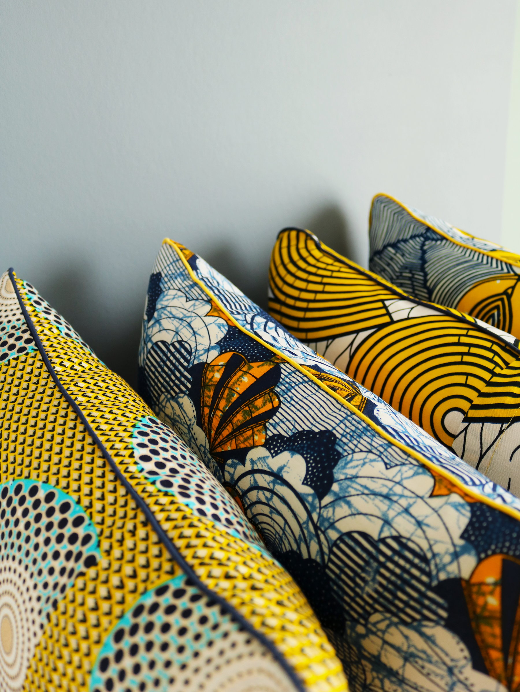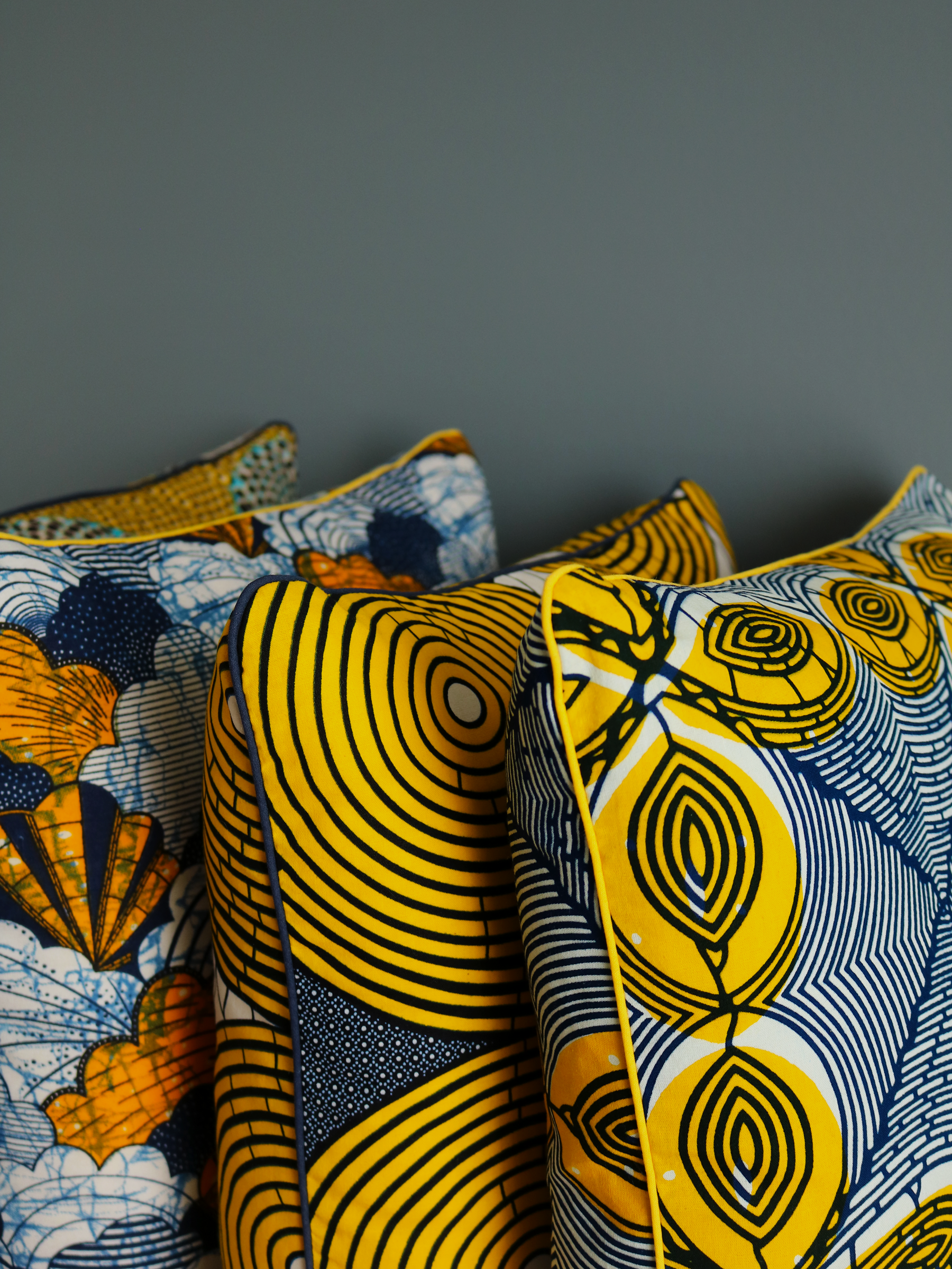 Pour m'adapter à vos besoins et à vos goûts, je vous propose un large choix de tissus pour la confection de vos coussins wax et housses de coussins ethniques sur-mesure.