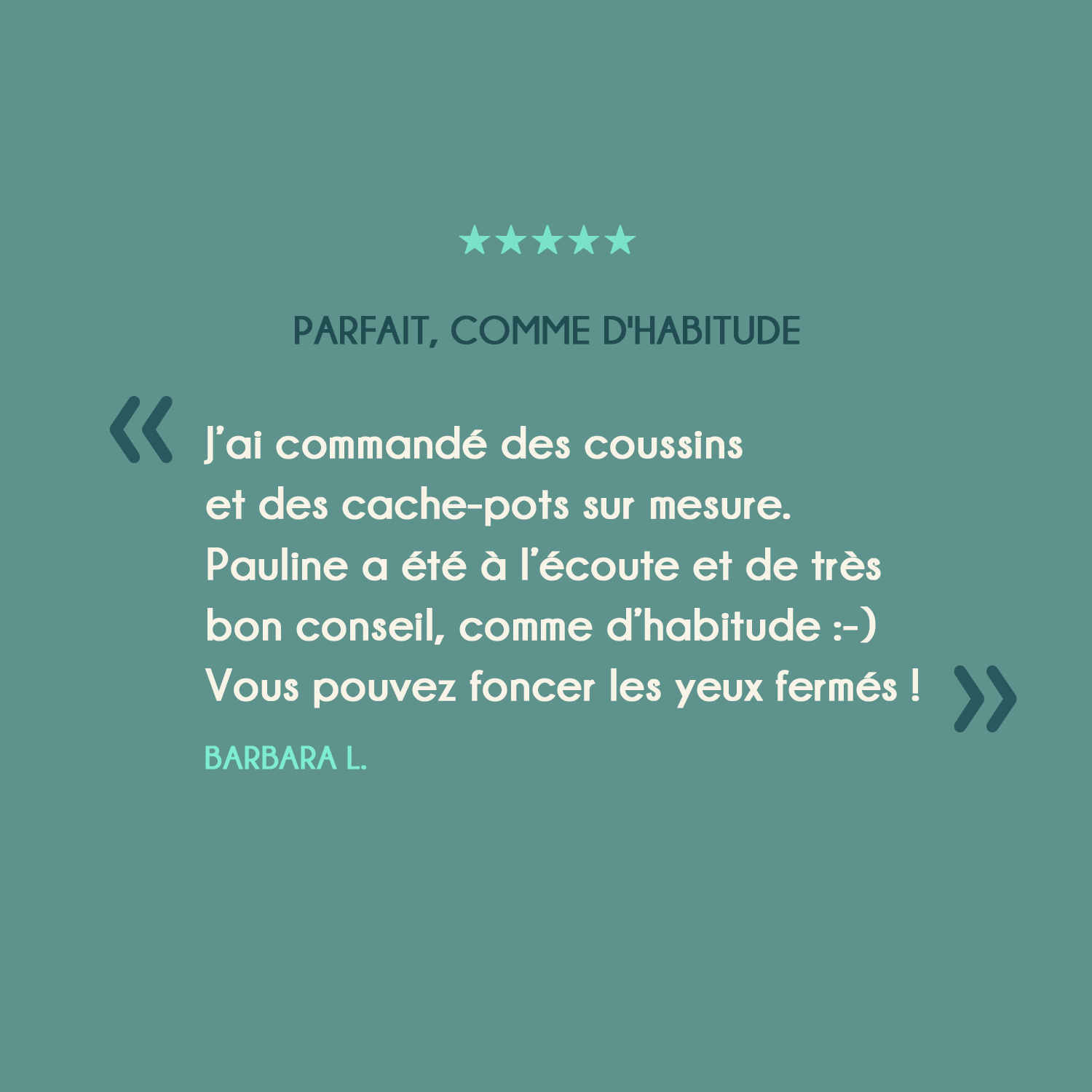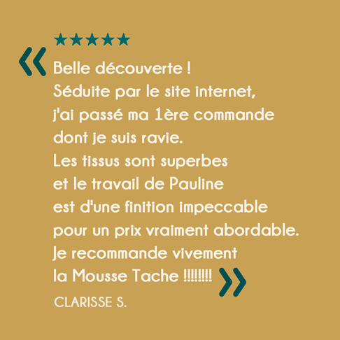 Le plus : je peux vous apporter des conseils de décoration et vous aider à sélectionner les tissus dans le catalogue à partir d'une palette de couleurs et/ou de photos de votre intérieur. Ensemble, nous concevrons le projet le plus adapté à vos besoins.
