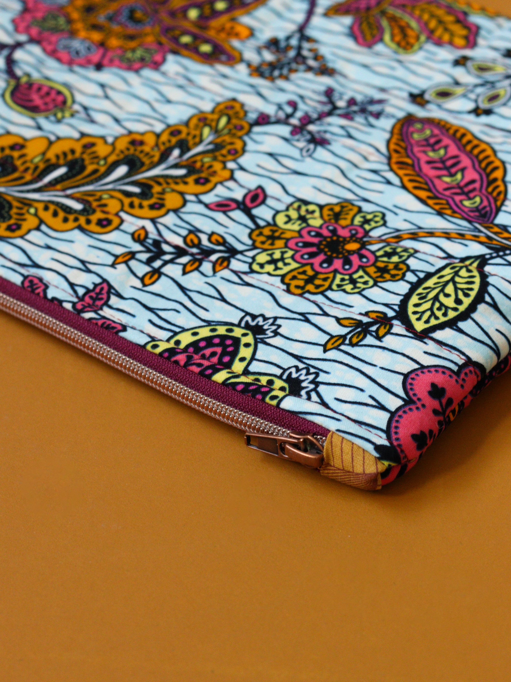 Cette pochette matelassée en wax style indienne est parfaite pour ranger vos petites affaires : un livre, du maquillage,... Tout ce qui traîne habituellement au fond du sac, vous le retrouverez en un instant. Les détails sont soignés : matelassage aux couleurs assorties et fermeture éclair cuivrée.