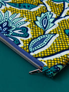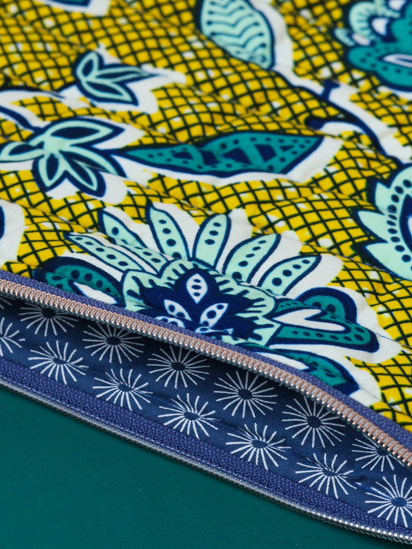 Cette pochette matelassée en wax jaune vif à fleurs turquoises est parfaite pour ranger vos petites affaires : un livre, du maquillage,... Tout ce qui traîne habituellement au fond du sac, vous le retrouverez en un instant. Les détails sont soignés : matelassage aux couleurs assorties et fermeture éclair cuivrée.