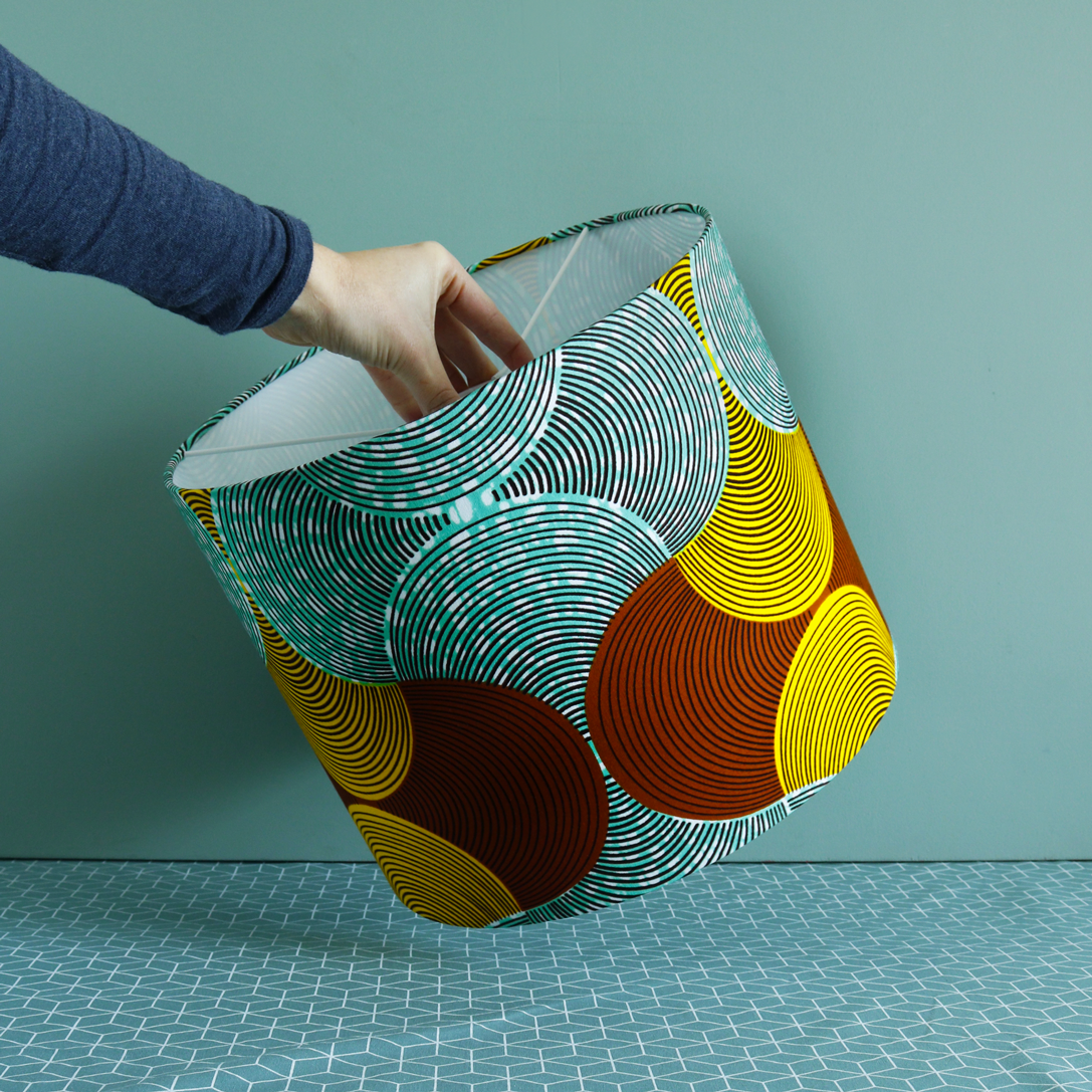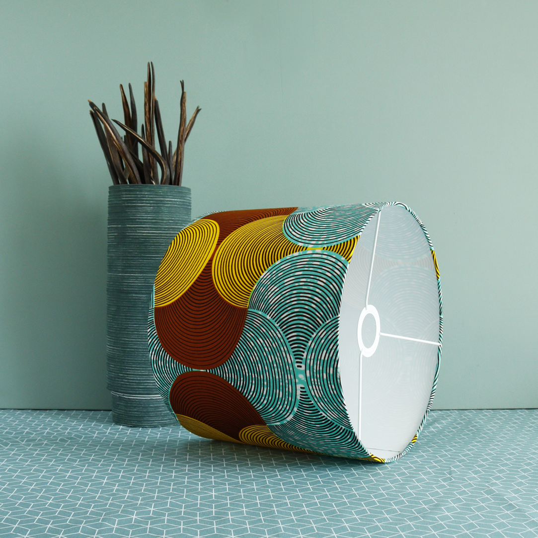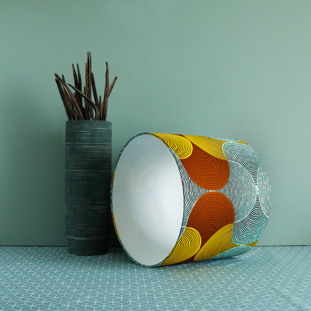 L'abat-jour sur-mesure en tissu africain réchauffe les intérieurs et illumine la décoration. Avec son tissu ethnique chic, cet abat-jour personnalisé s'invite dans toutes les pièces de la maison : en suspension au dessus de la table à manger, en abat-jour de lampe sur la table de nuit, …