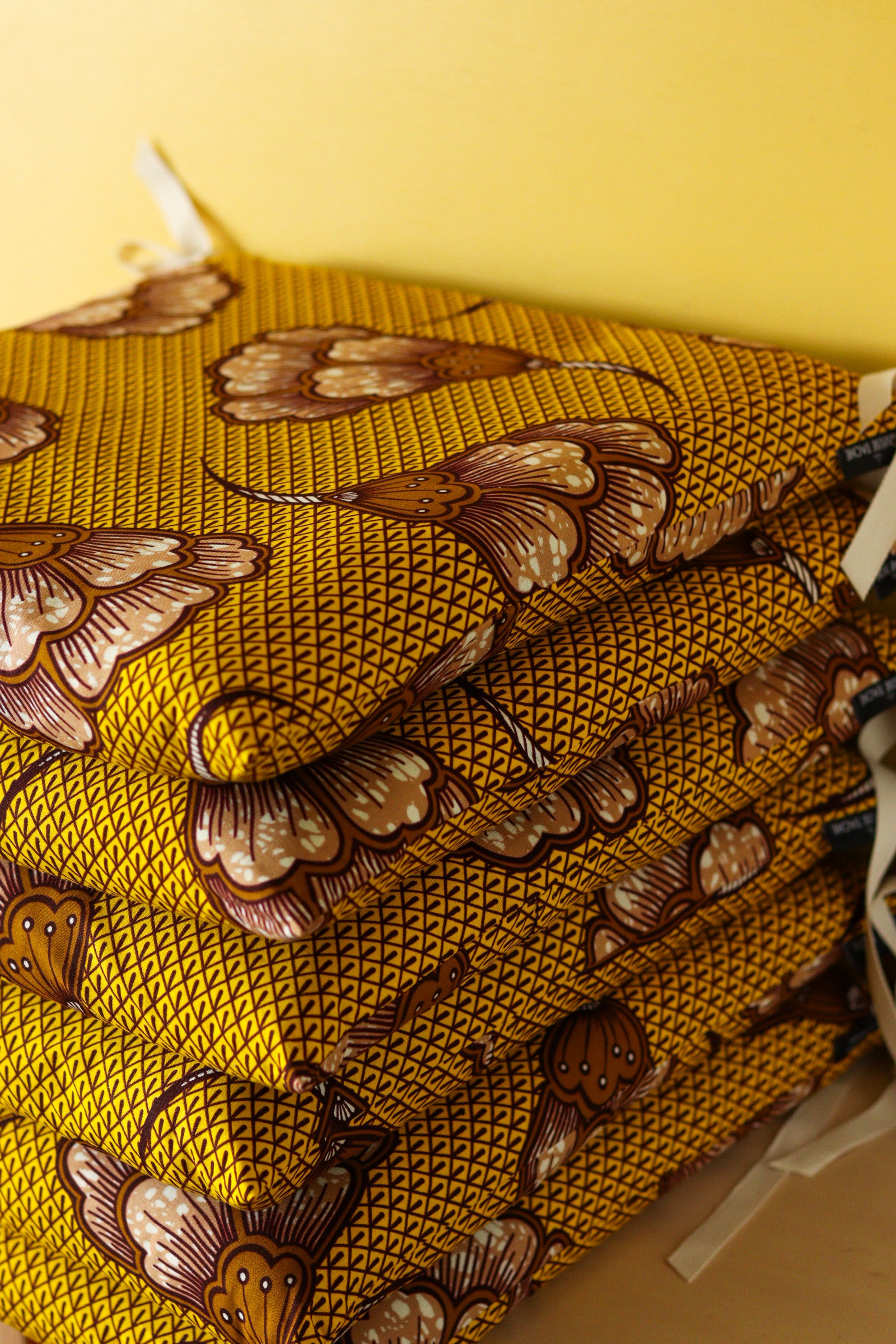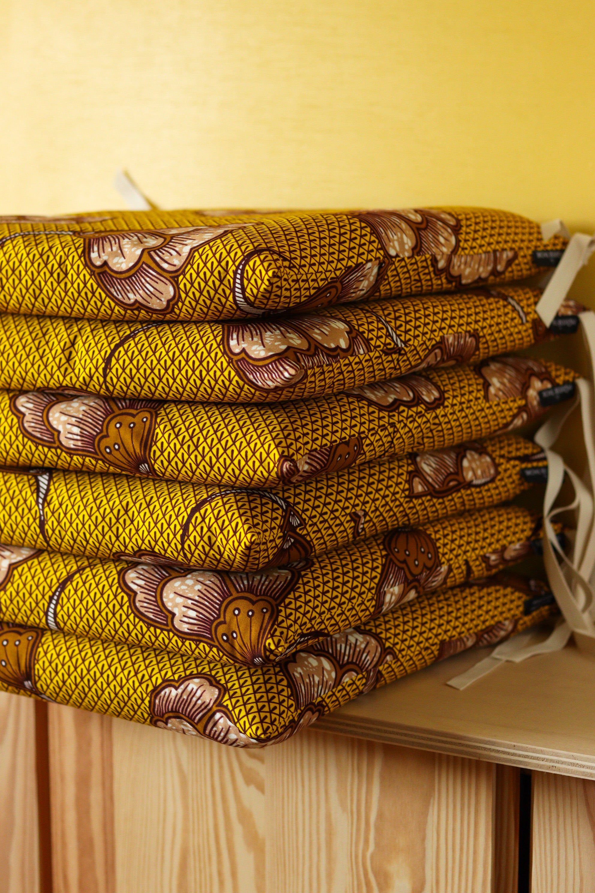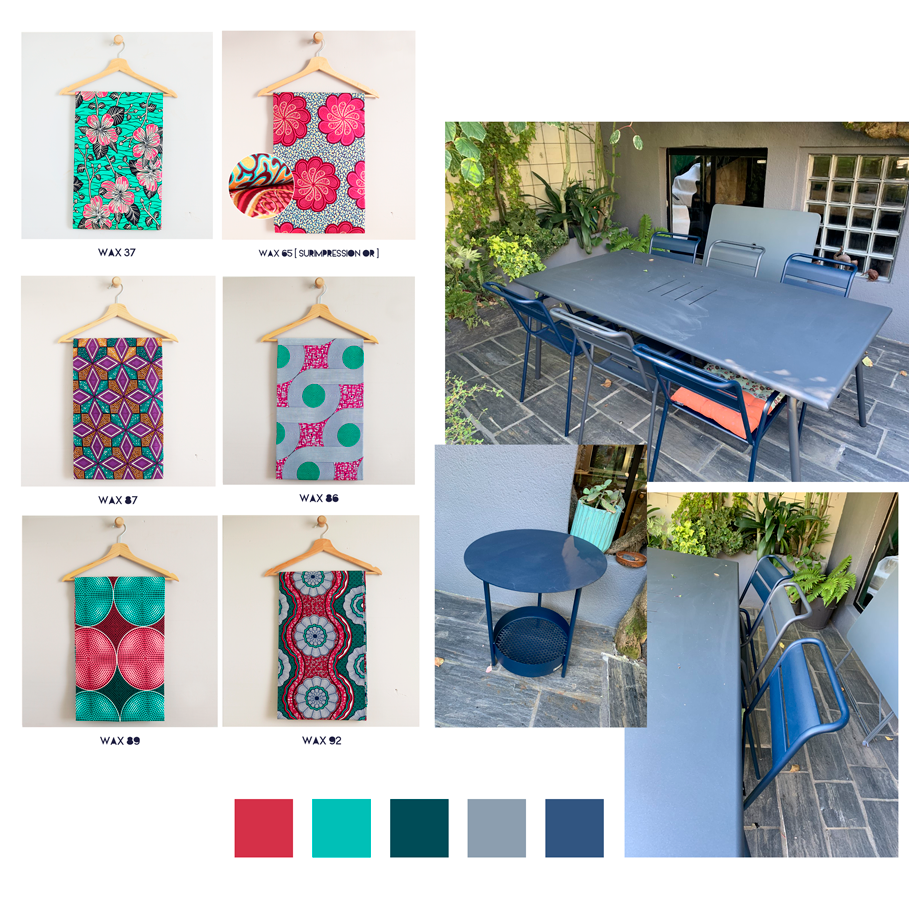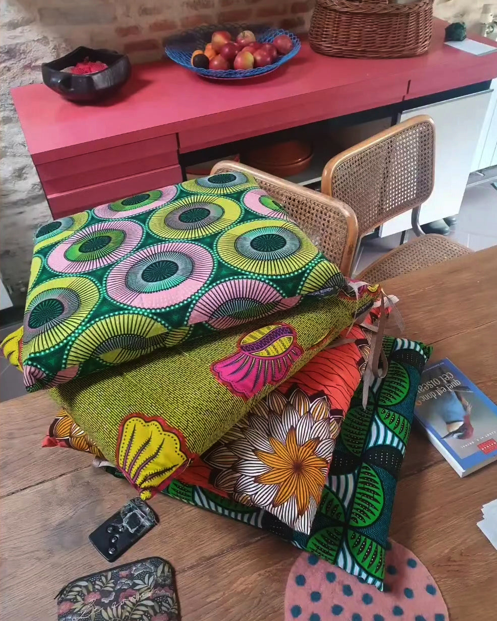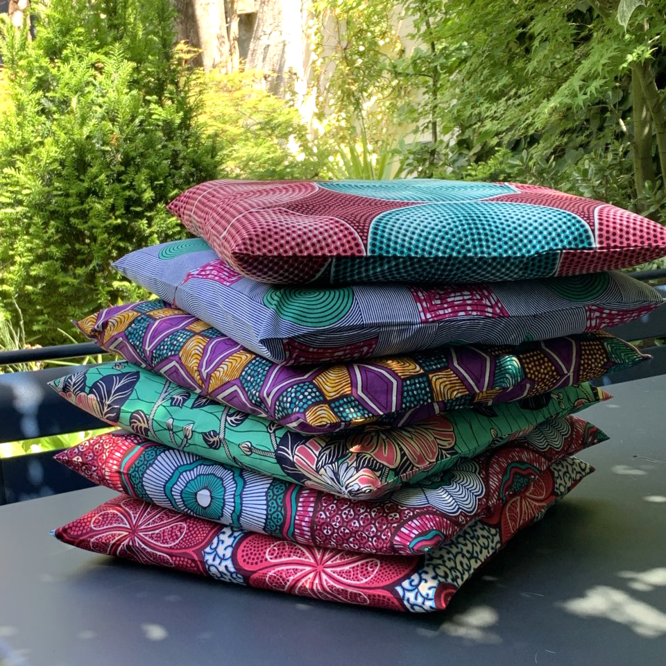 Afin d'apporter une touche colorée sur sa terrasse, Caroline m'a demandé de réaliser des housses de coussins en wax sur-mesure pour ses galettes de chaise existantes. Le mobilier de jardin et les murs ayant des teintes neutres, il n'y avait pas de contraintes de couleurs.