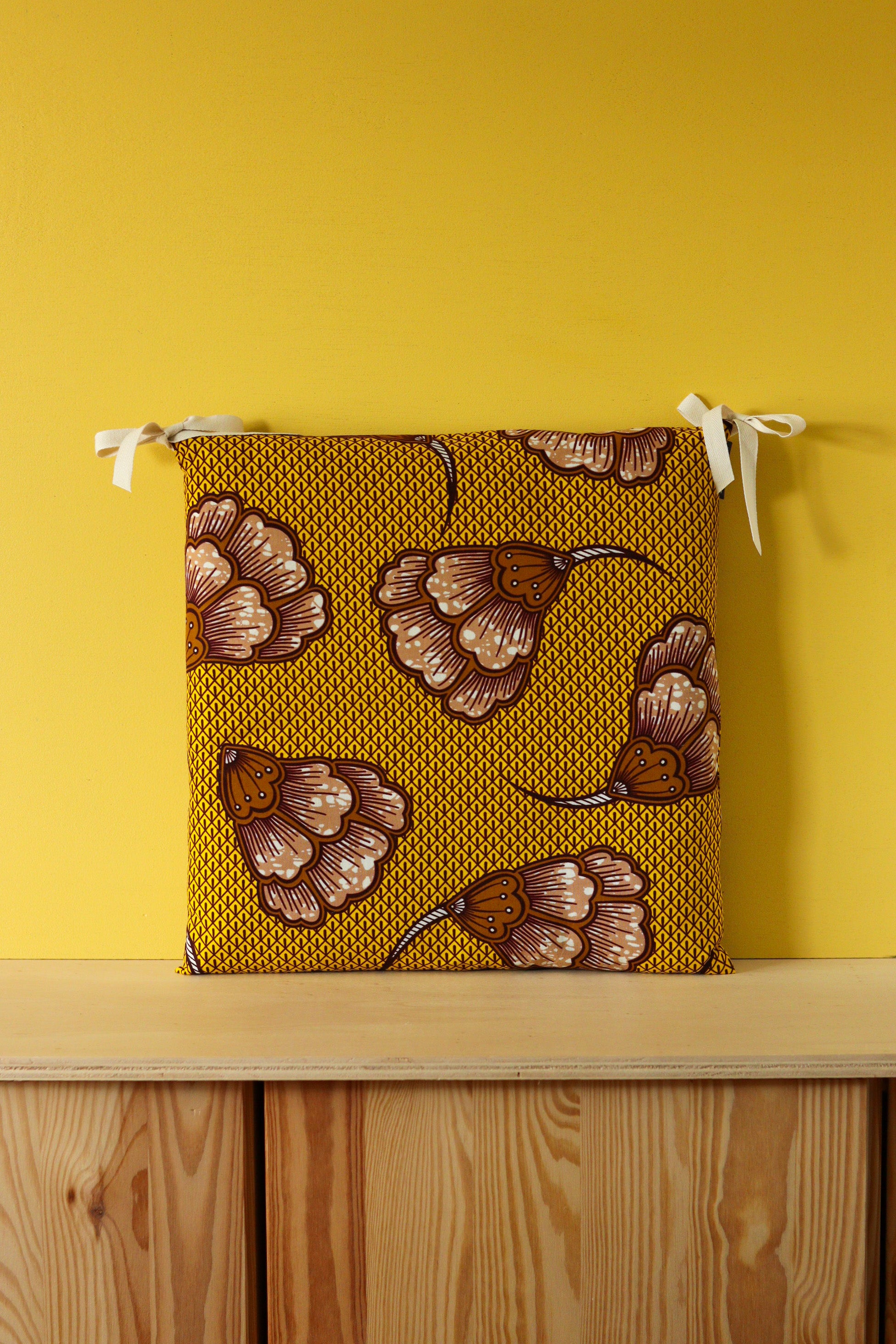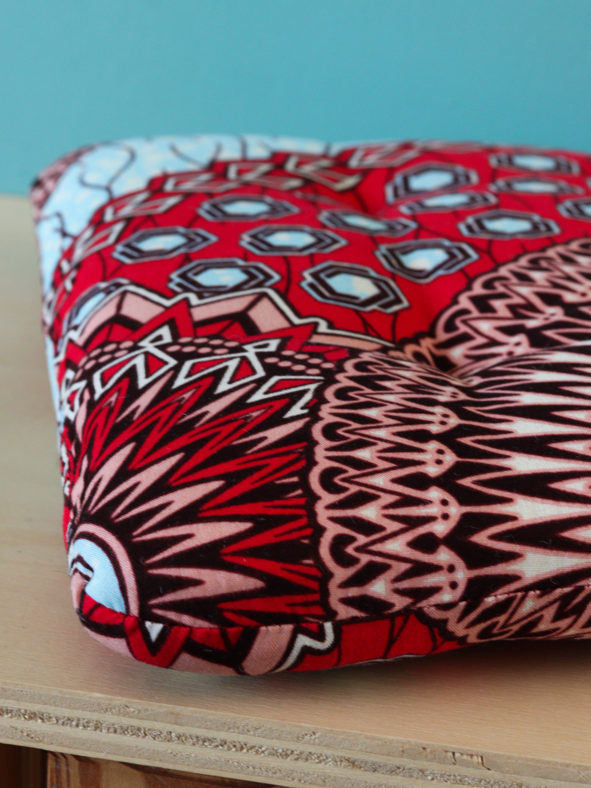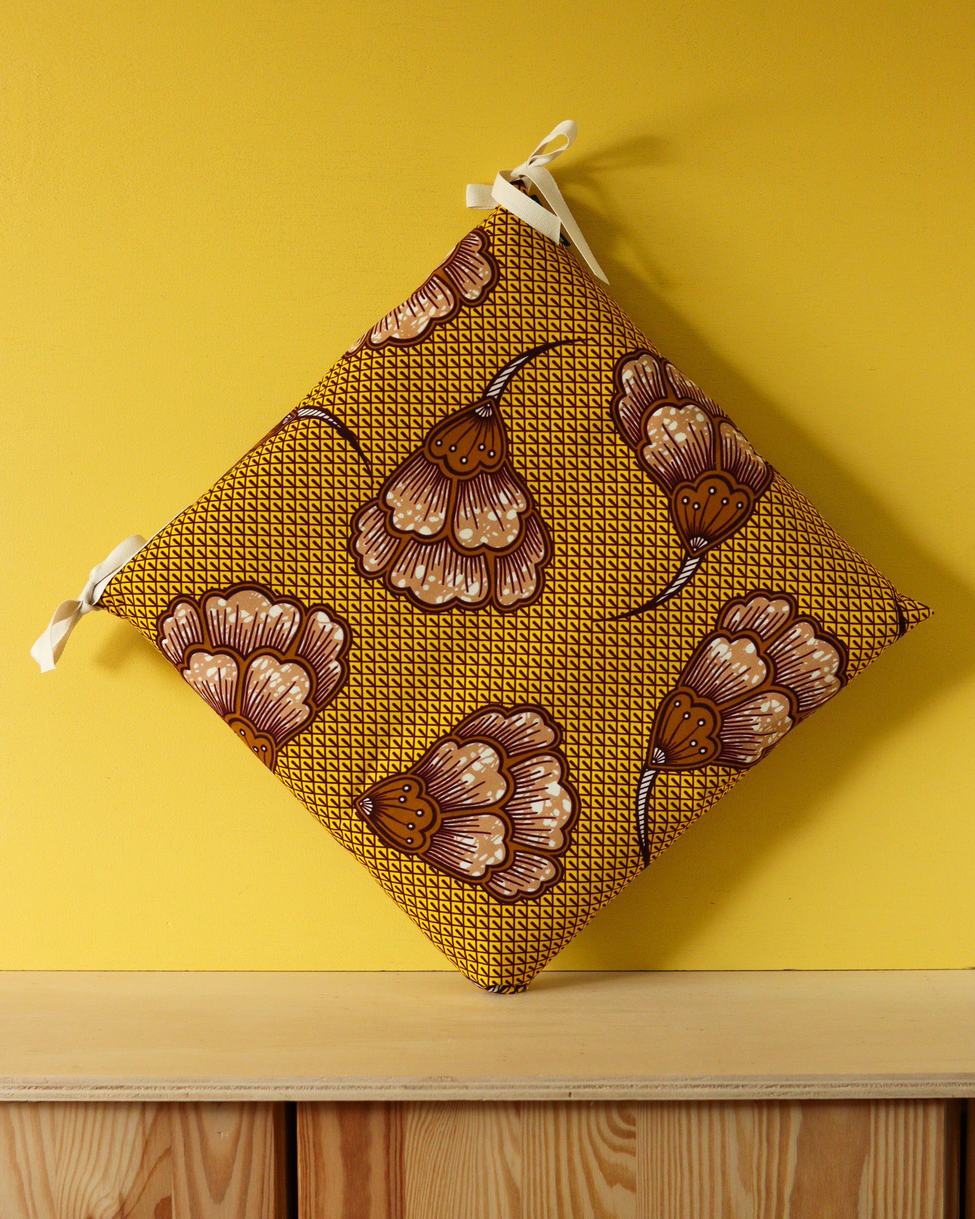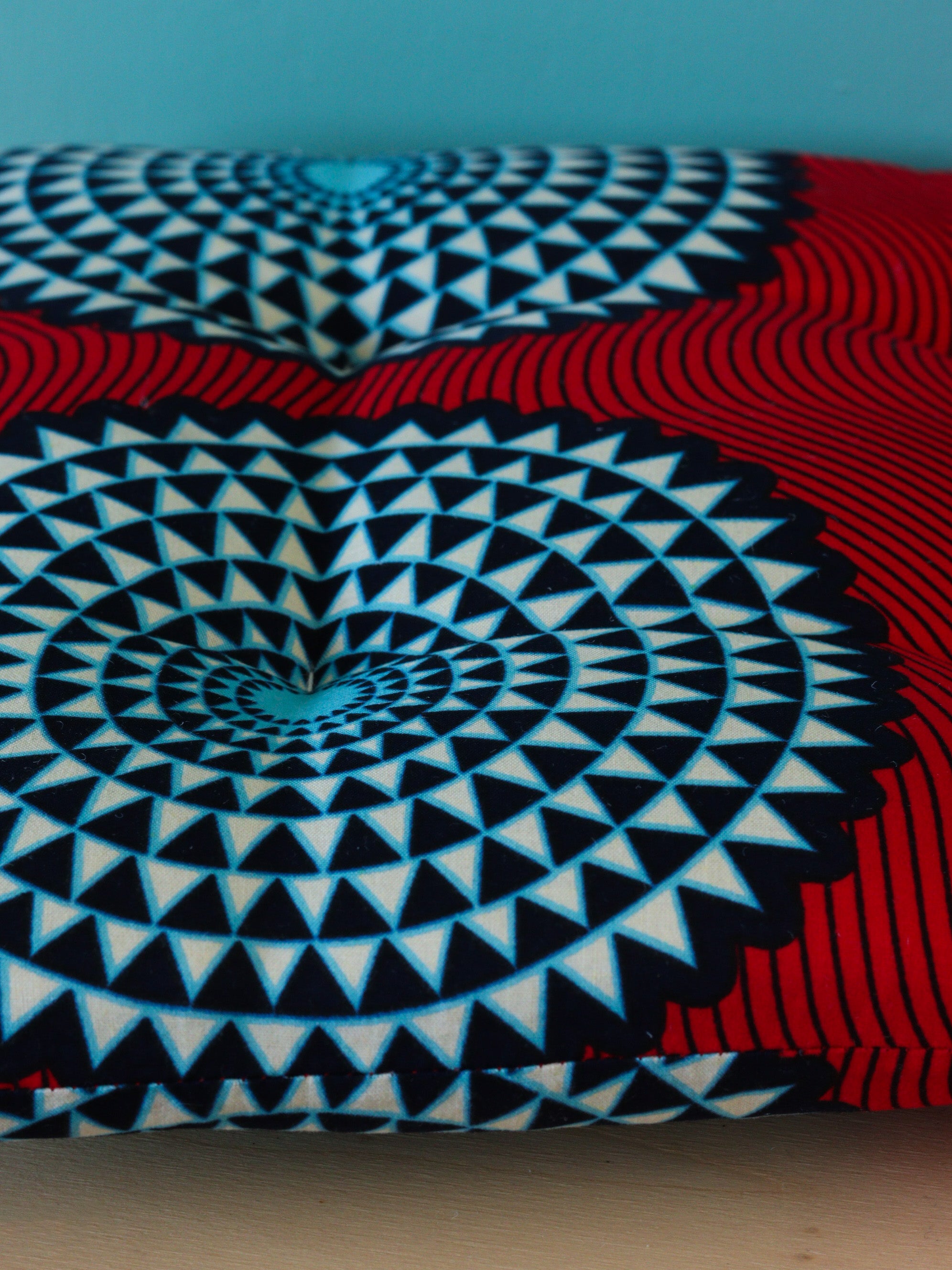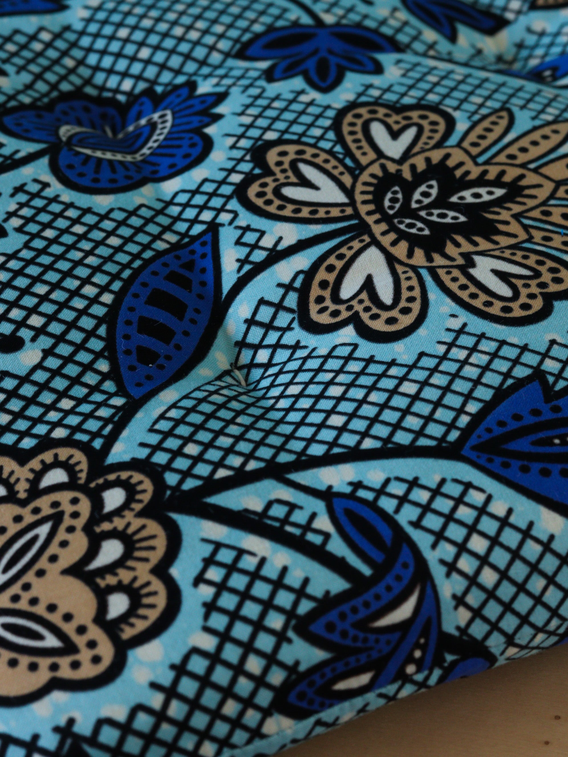 Afin d'apporter une touche colorée sur sa terrasse, Caroline m'a demandé de réaliser des housses de coussins en wax sur-mesure pour ses galettes de chaise existantes. Le mobilier de jardin et les murs ayant des teintes neutres, il n'y avait pas de contraintes de couleurs.