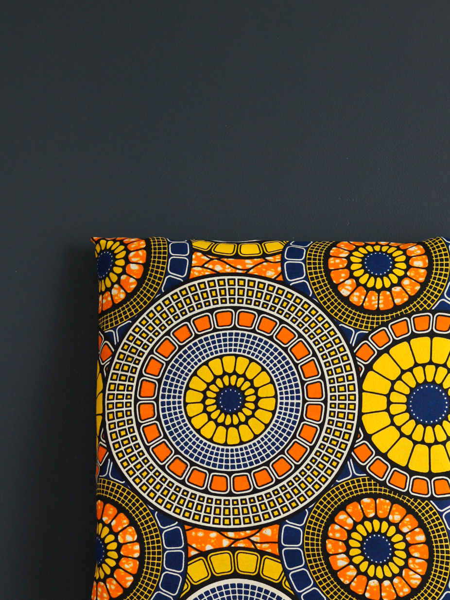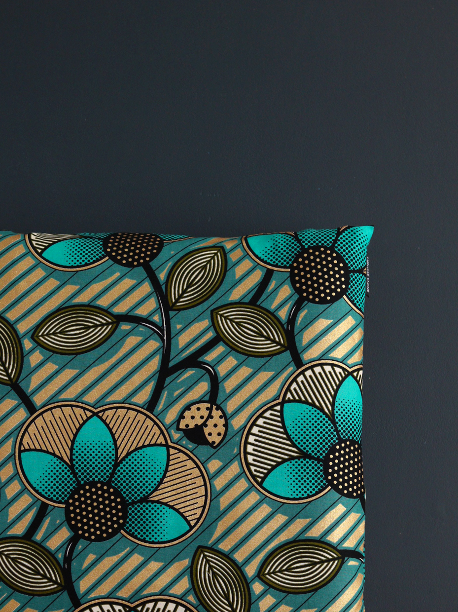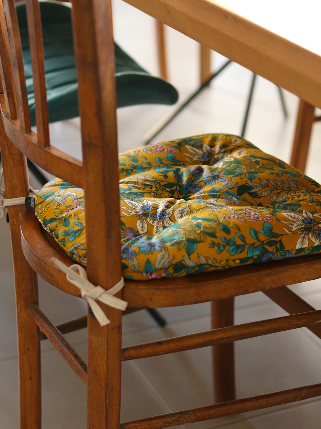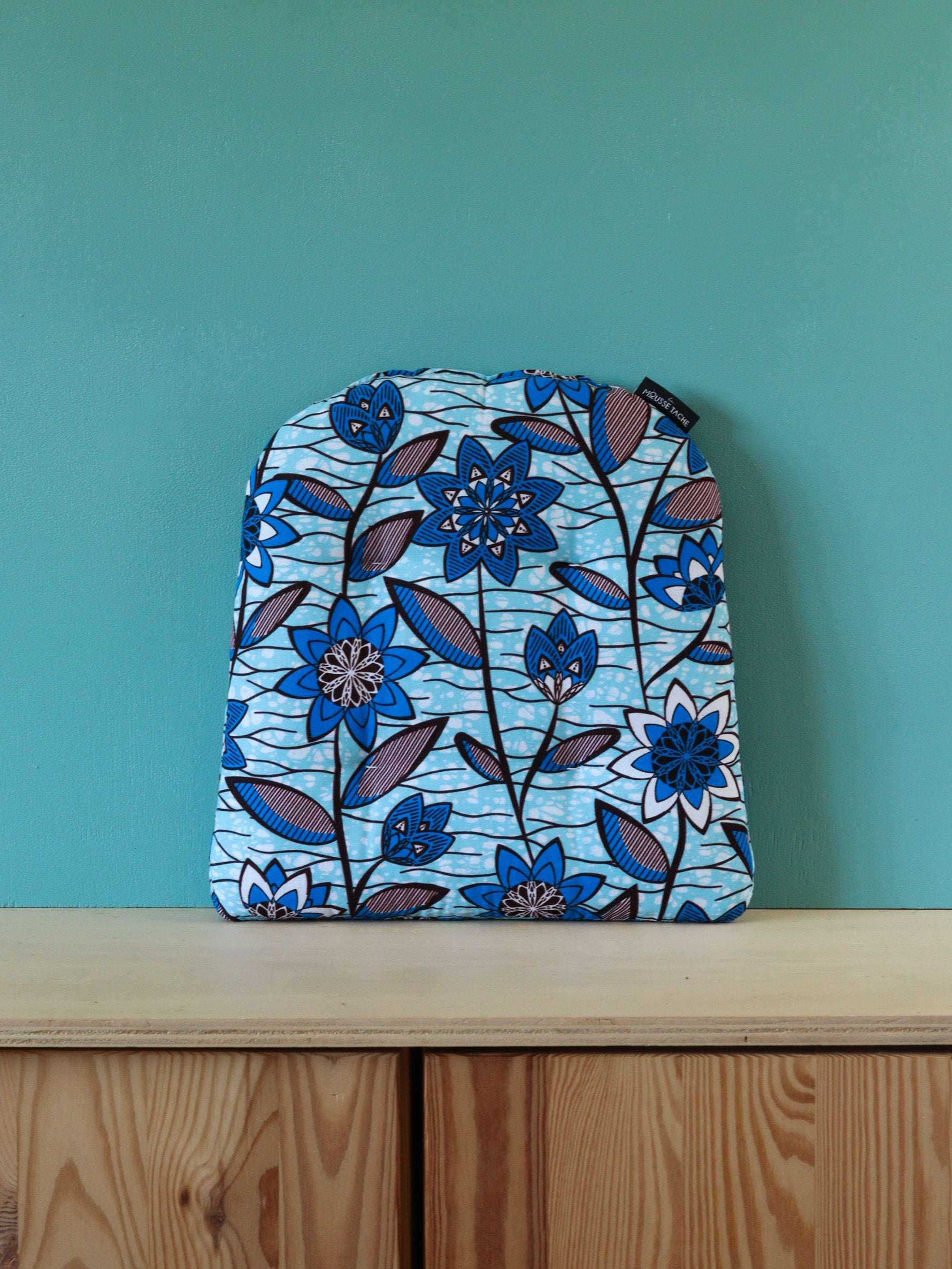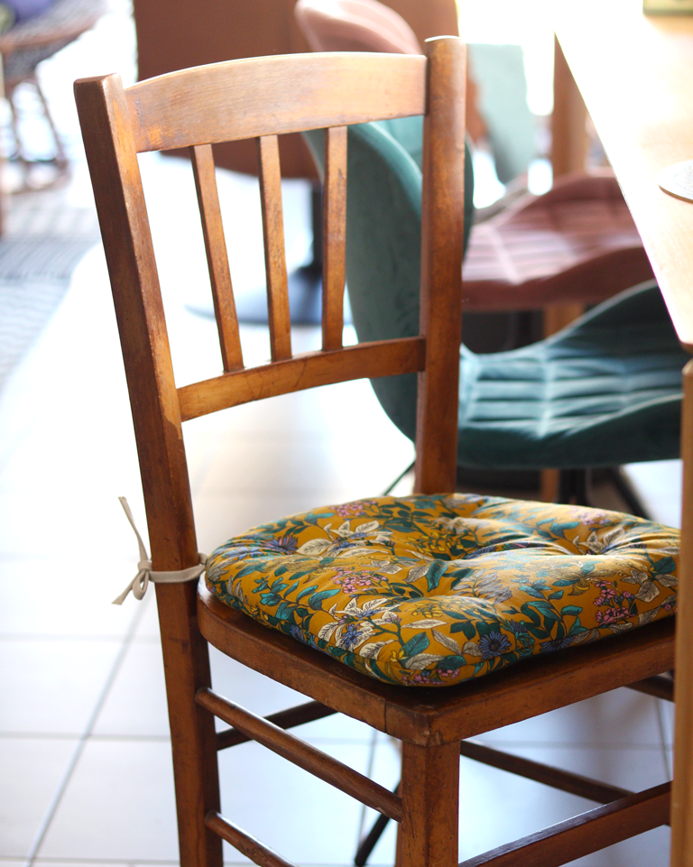 Afin d'apporter une touche colorée sur sa terrasse, Caroline m'a demandé de réaliser des housses de coussins en wax sur-mesure pour ses galettes de chaise existantes. Le mobilier de jardin et les murs ayant des teintes neutres, il n'y avait pas de contraintes de couleurs.