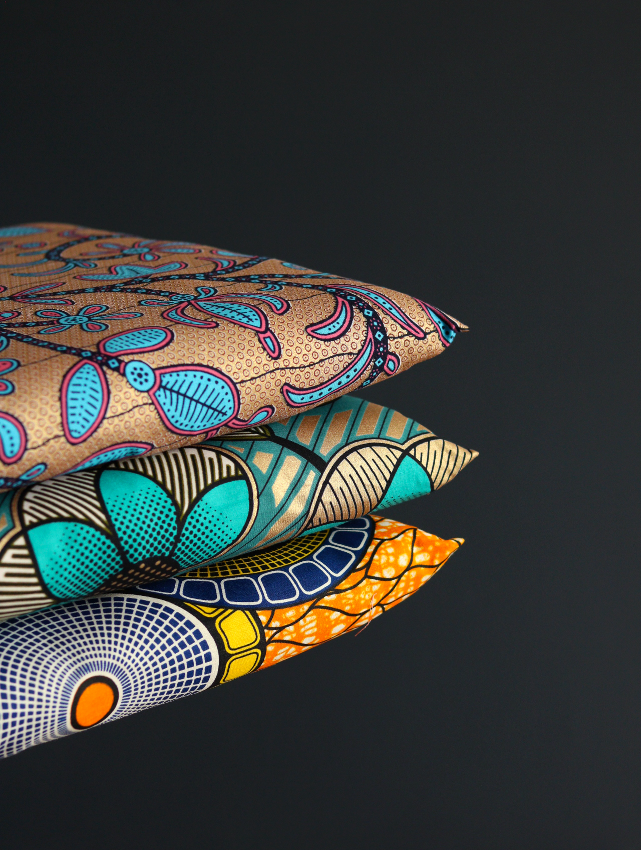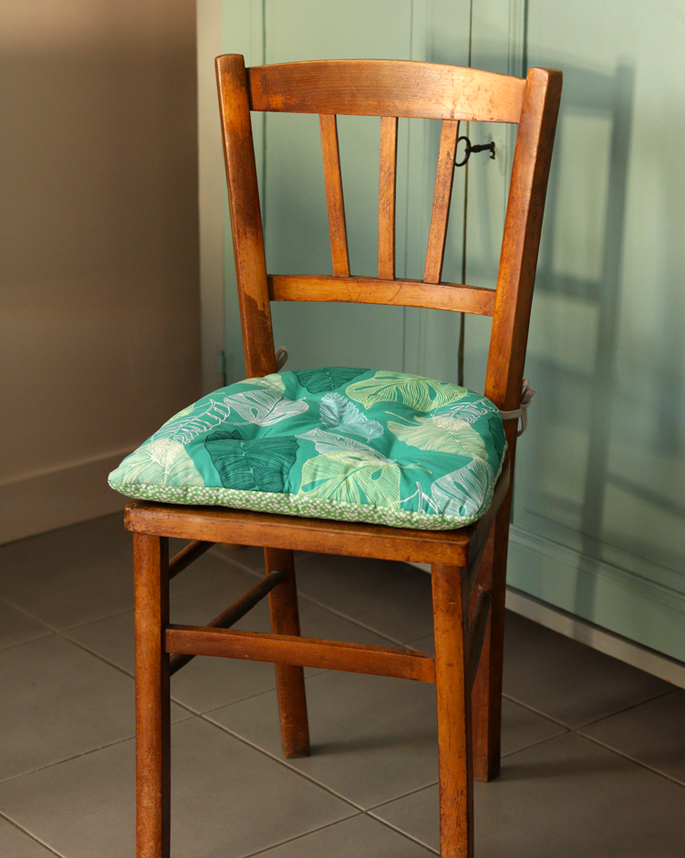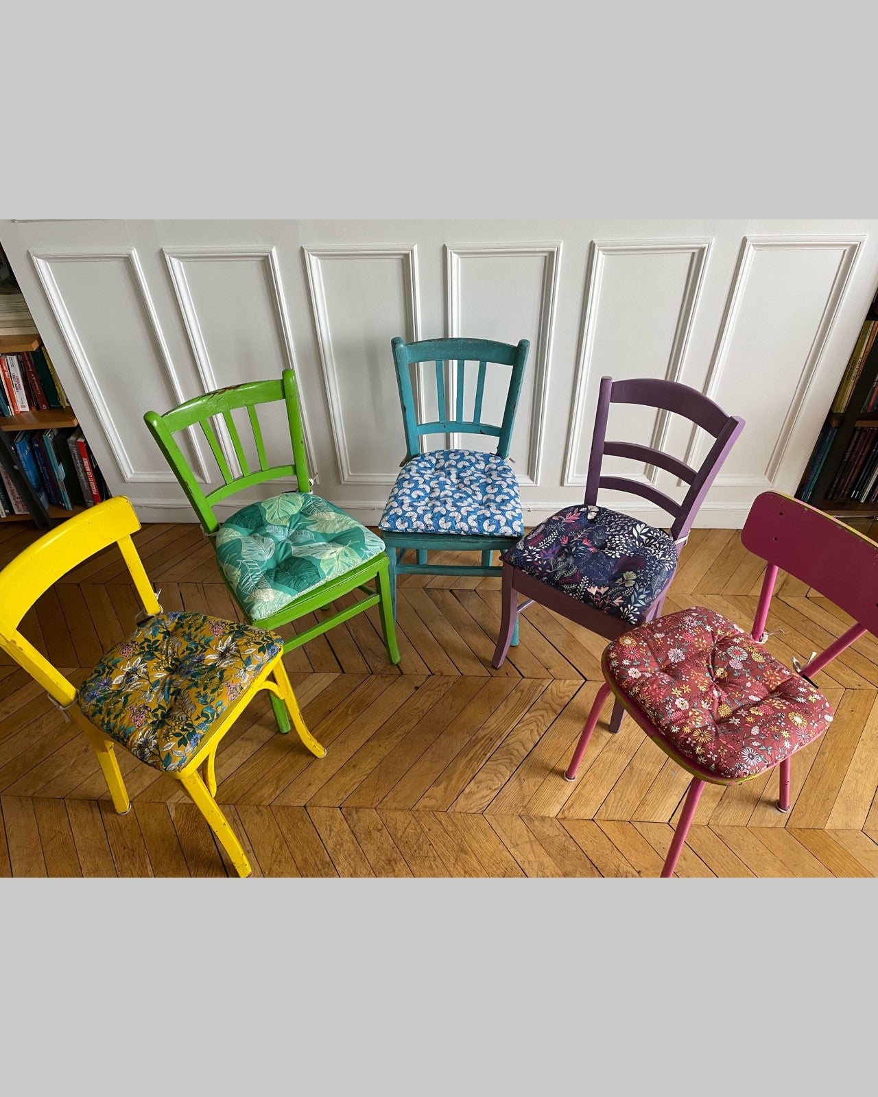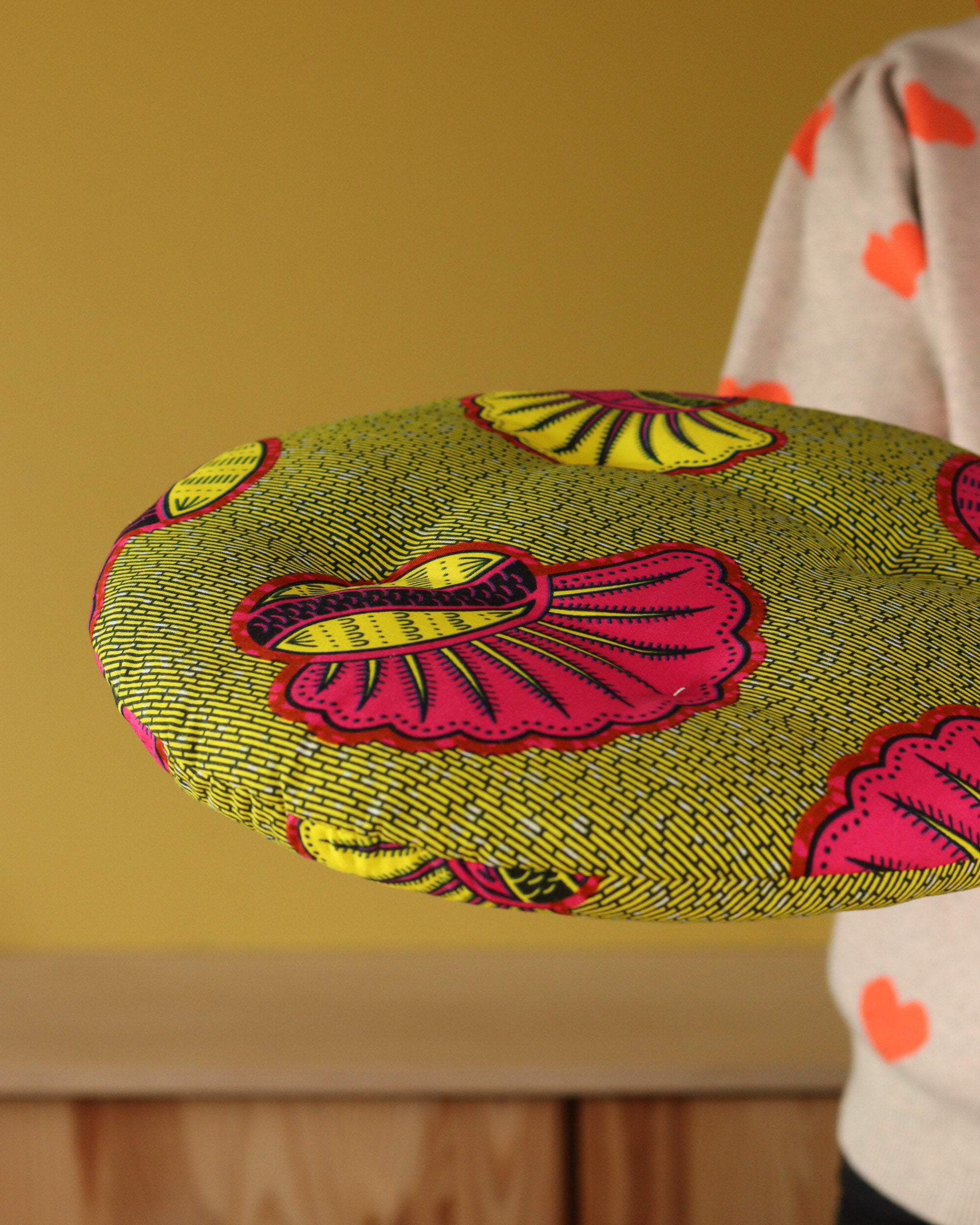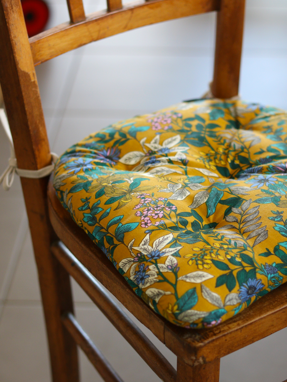 Afin d'apporter une touche colorée sur sa terrasse, Caroline m'a demandé de réaliser des housses de coussins en wax sur-mesure pour ses galettes de chaise existantes. Le mobilier de jardin et les murs ayant des teintes neutres, il n'y avait pas de contraintes de couleurs.