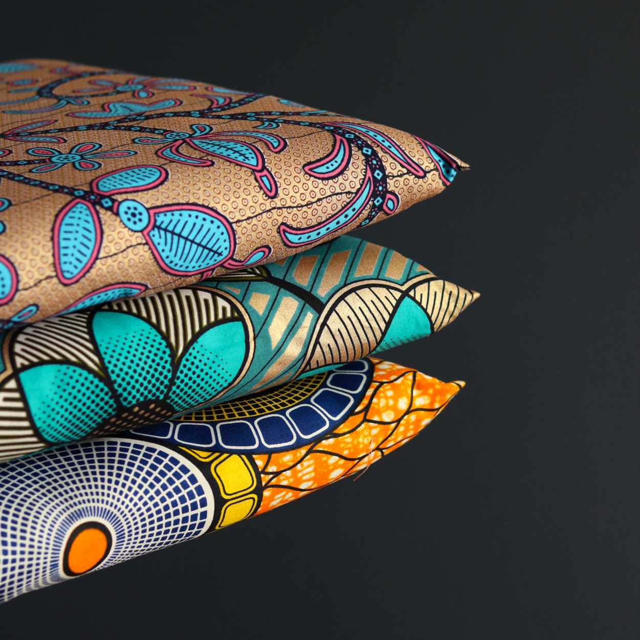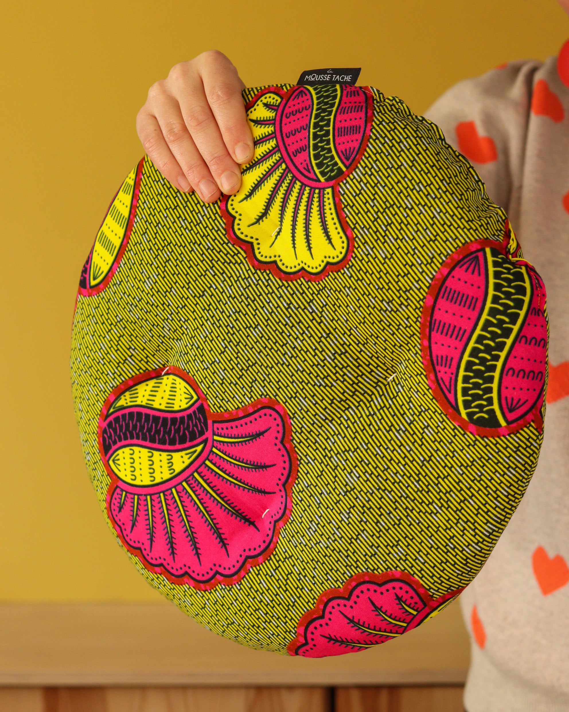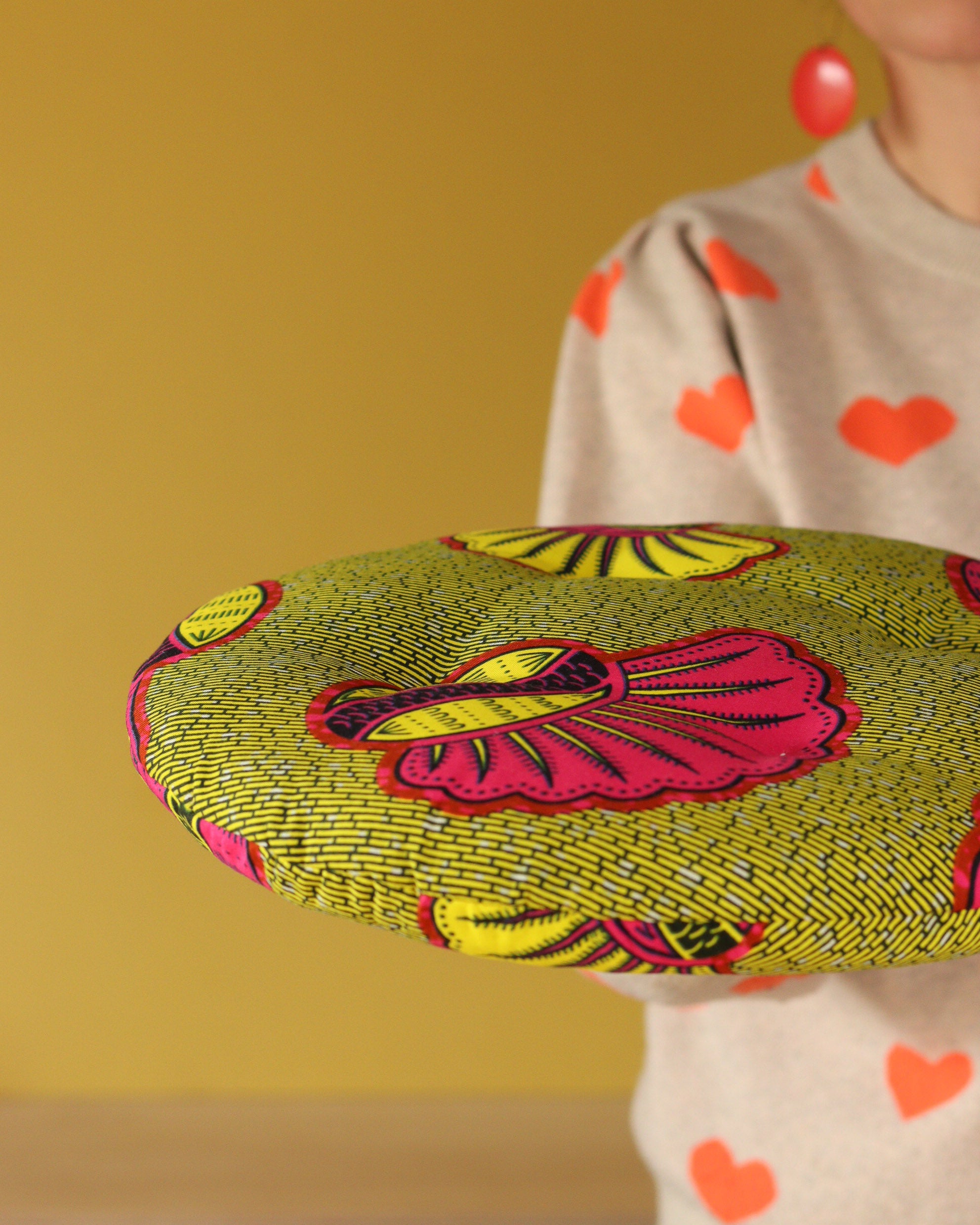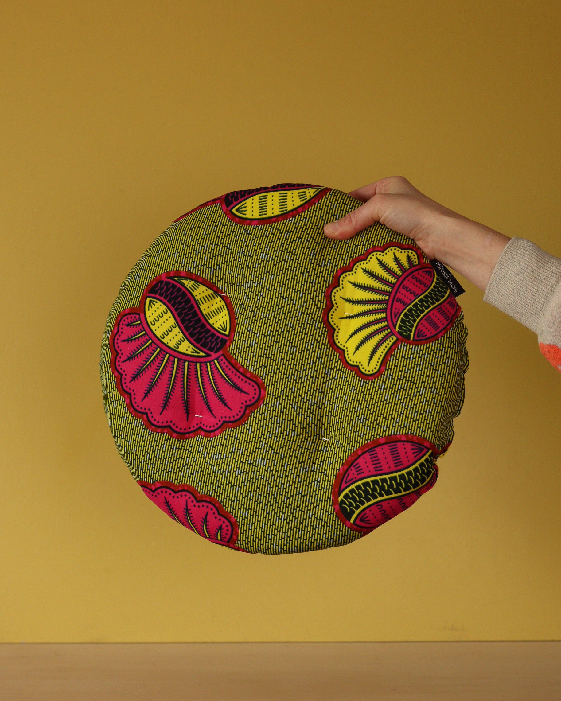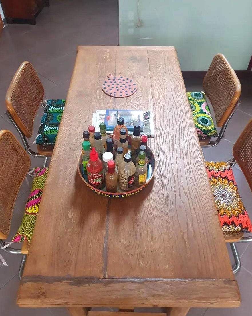 Afin d'apporter une touche colorée sur sa terrasse, Caroline m'a demandé de réaliser des housses de coussins en wax sur-mesure pour ses galettes de chaise existantes. Le mobilier de jardin et les murs ayant des teintes neutres, il n'y avait pas de contraintes de couleurs.
