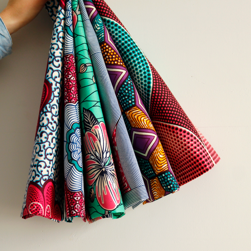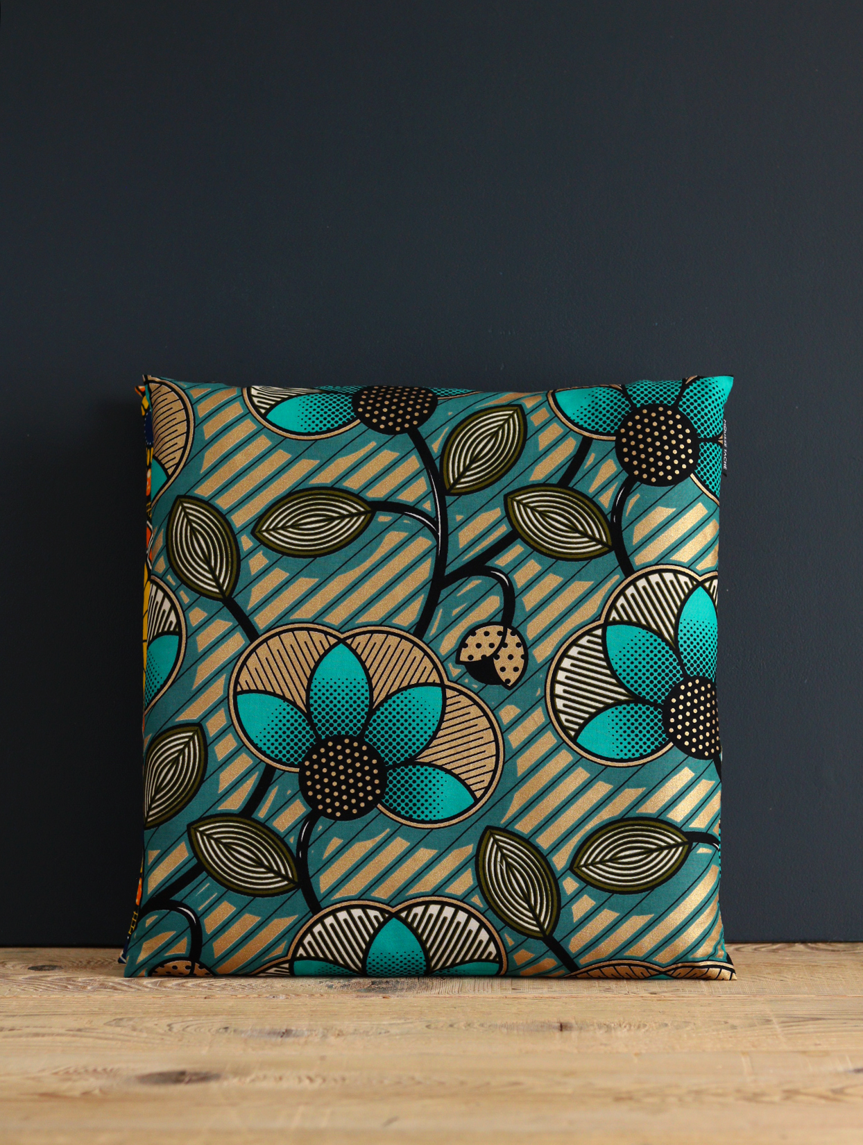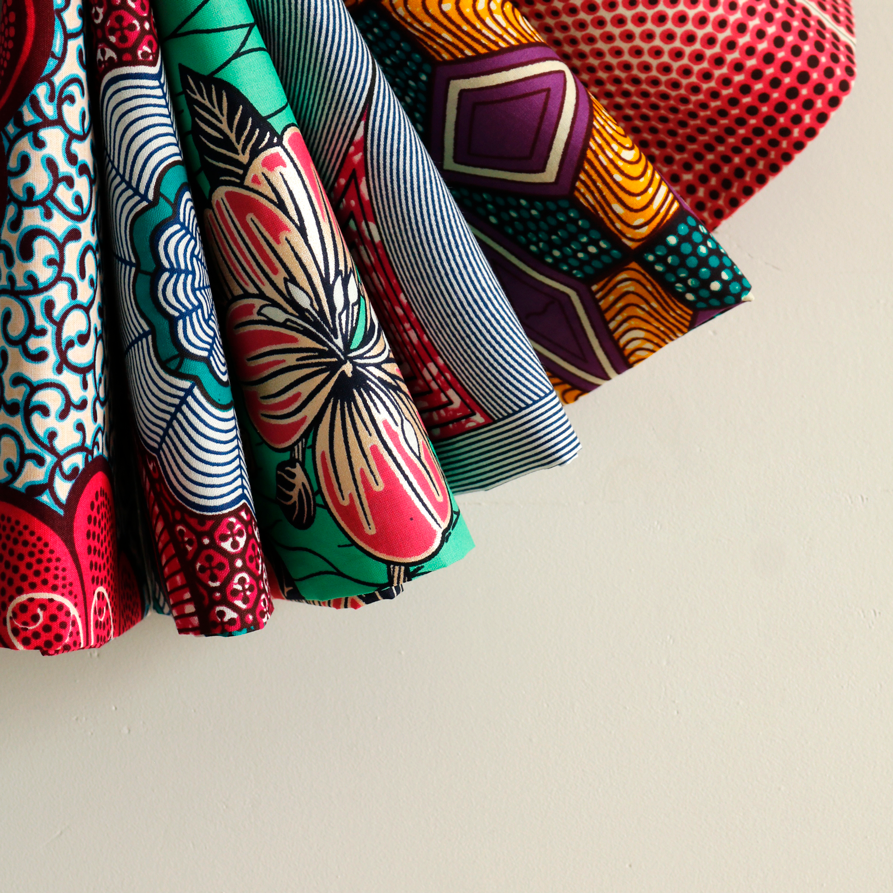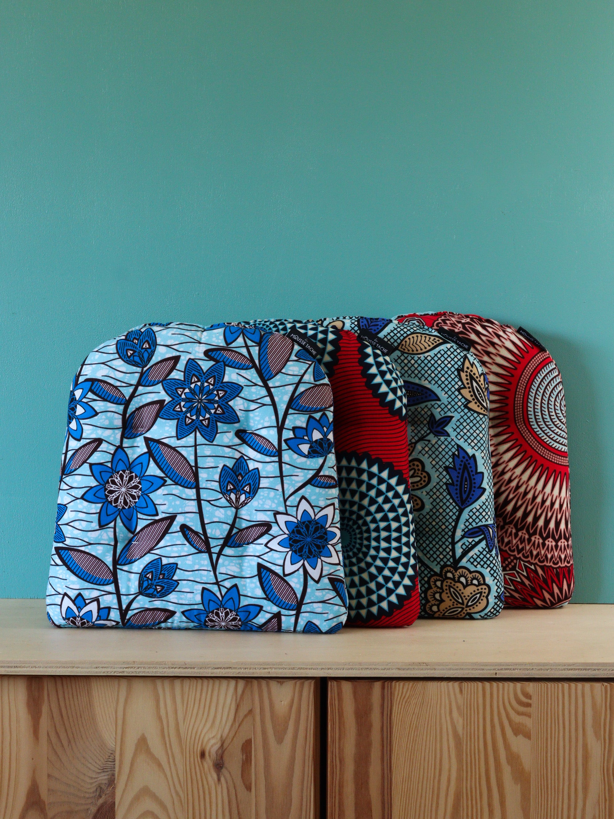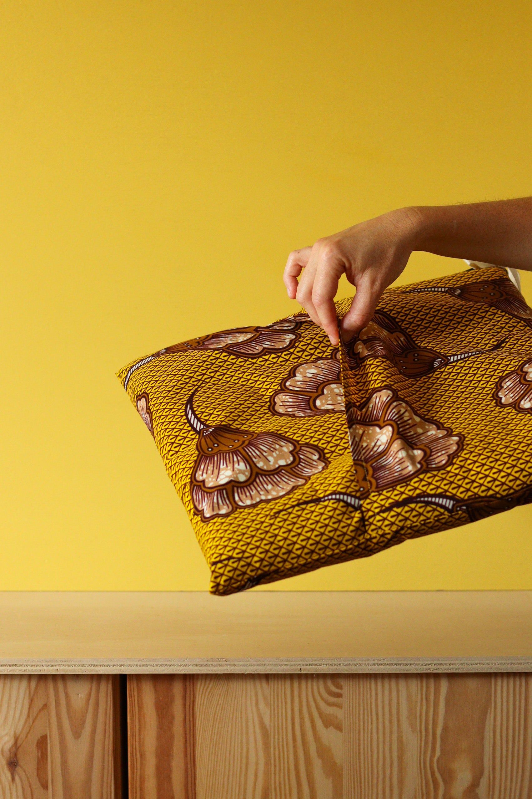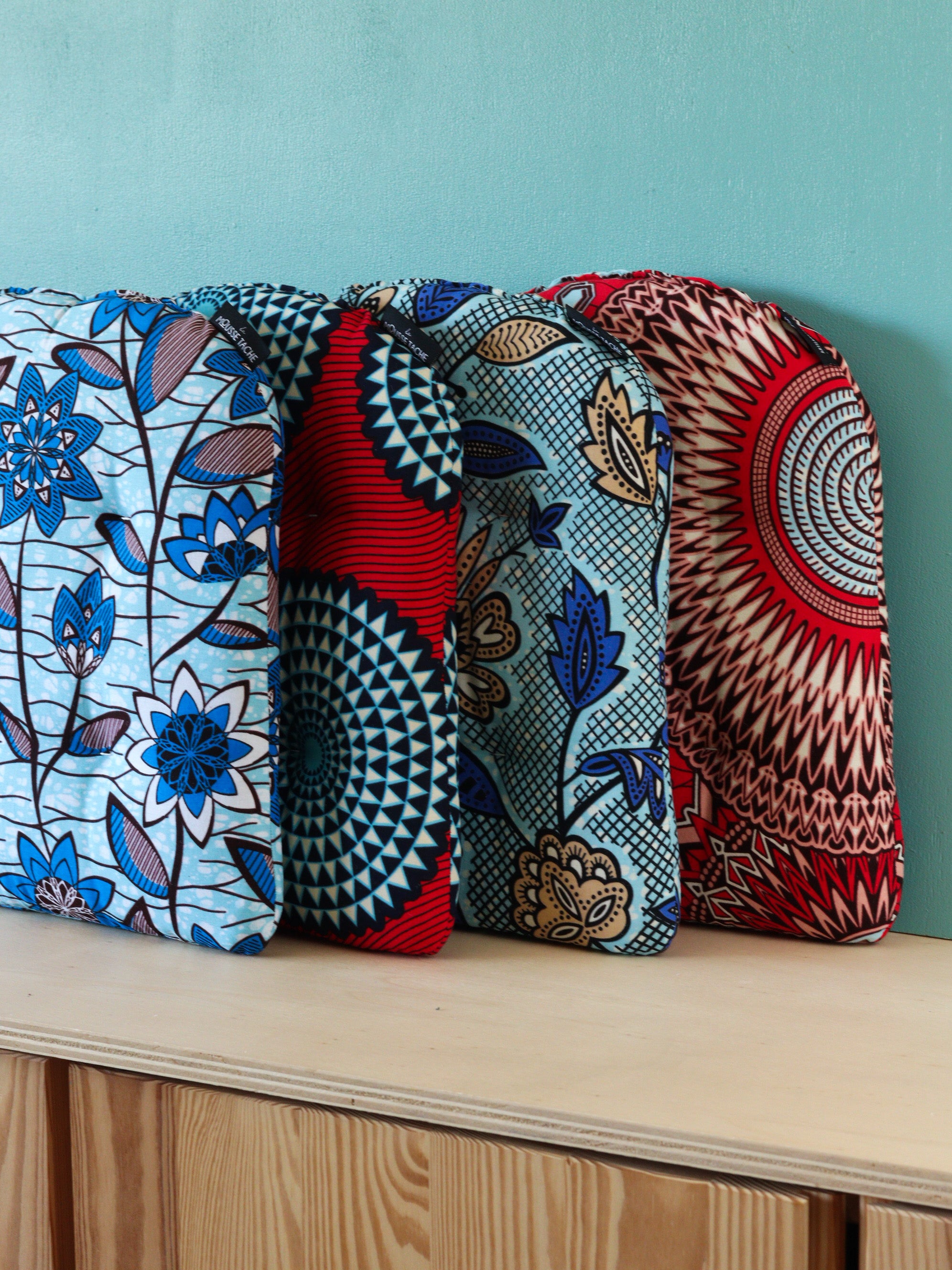 Afin d'apporter une touche colorée sur sa terrasse, Caroline m'a demandé de réaliser des housses de coussins en wax sur-mesure pour ses galettes de chaise existantes. Le mobilier de jardin et les murs ayant des teintes neutres, il n'y avait pas de contraintes de couleurs.