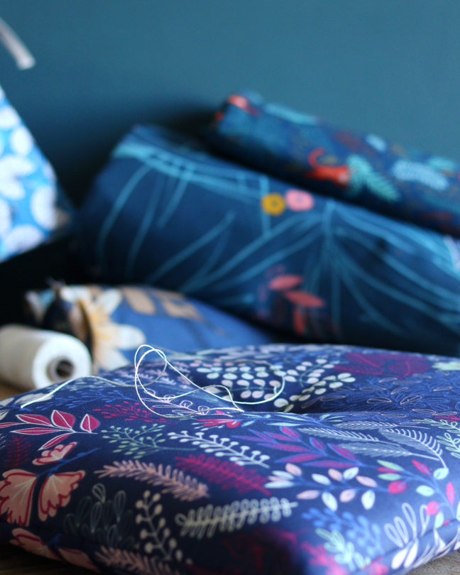 Pour construire le projet, nous nous sommes inspirées du projet qu'elle préférait dans ceux déjà réalisés : celui des coussins de terrasse de la société d'édition de musique parisienne. Certains imprimés étant épuisés, nous avons complété avec des tissus du style exotique dans les mêmes coloris. Quelques ajustements plus tard, la confection était lancée.
