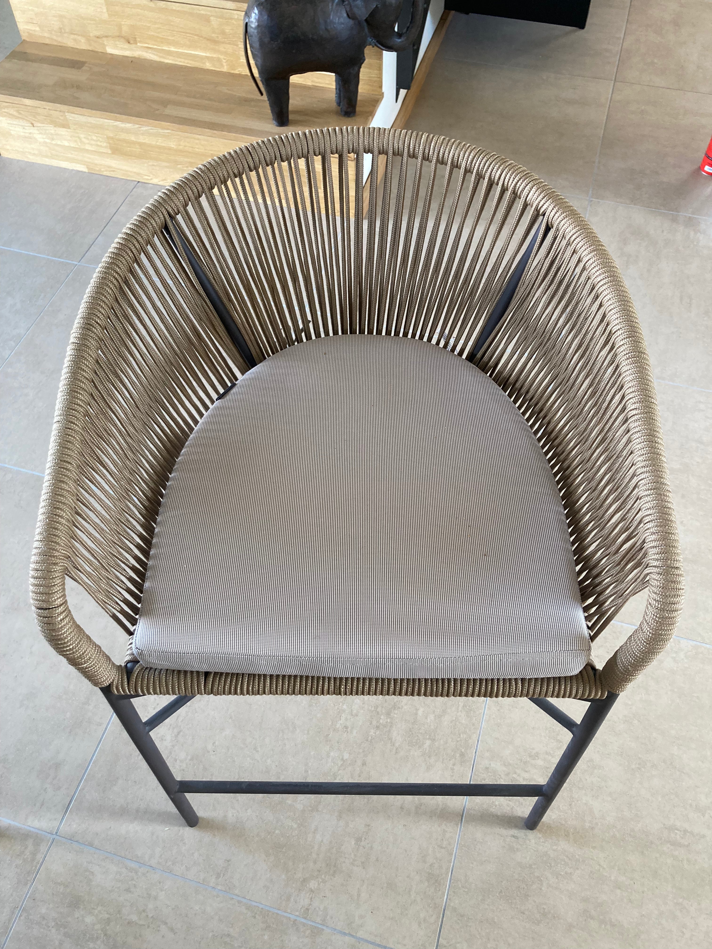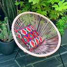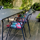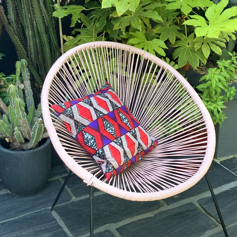 J'adore le résultat ! Les galettes de chaise en wax amènent la touche colorée qu'elle souhaitait sur sa terrasse et le coussin en wax sur le fauteuil Acapulco au milieu des cactus est parfait pour créer une ambiance exotique.